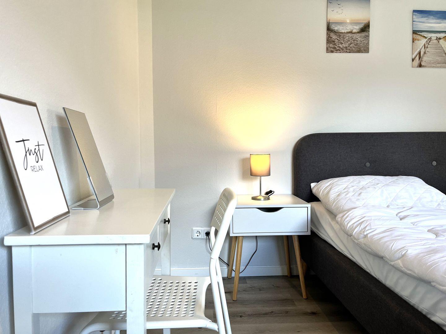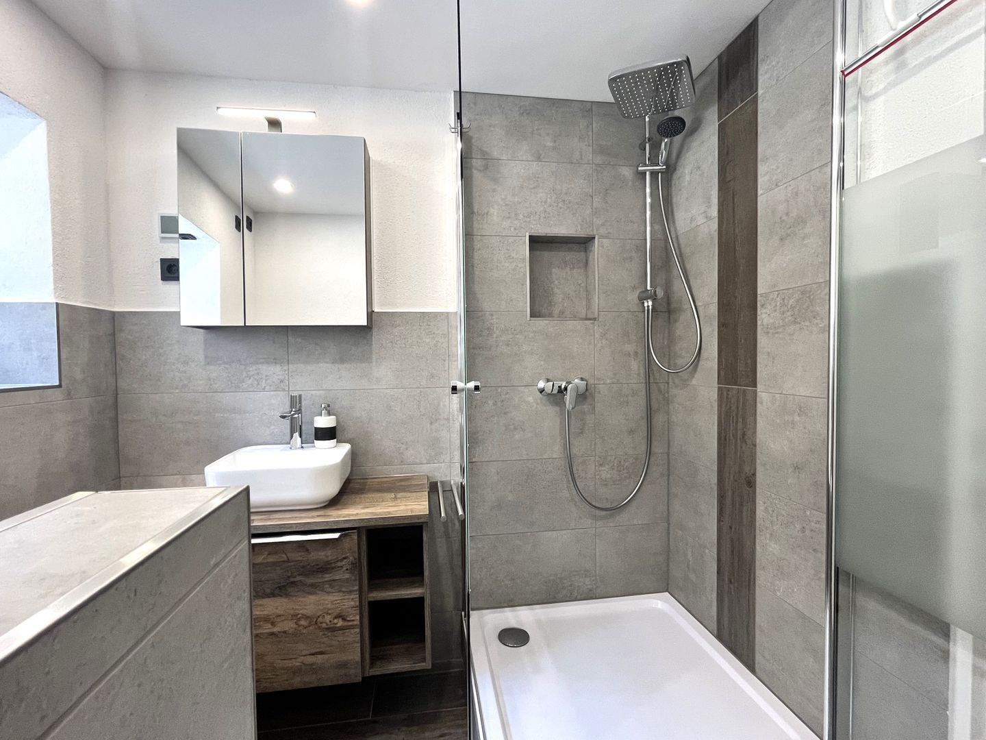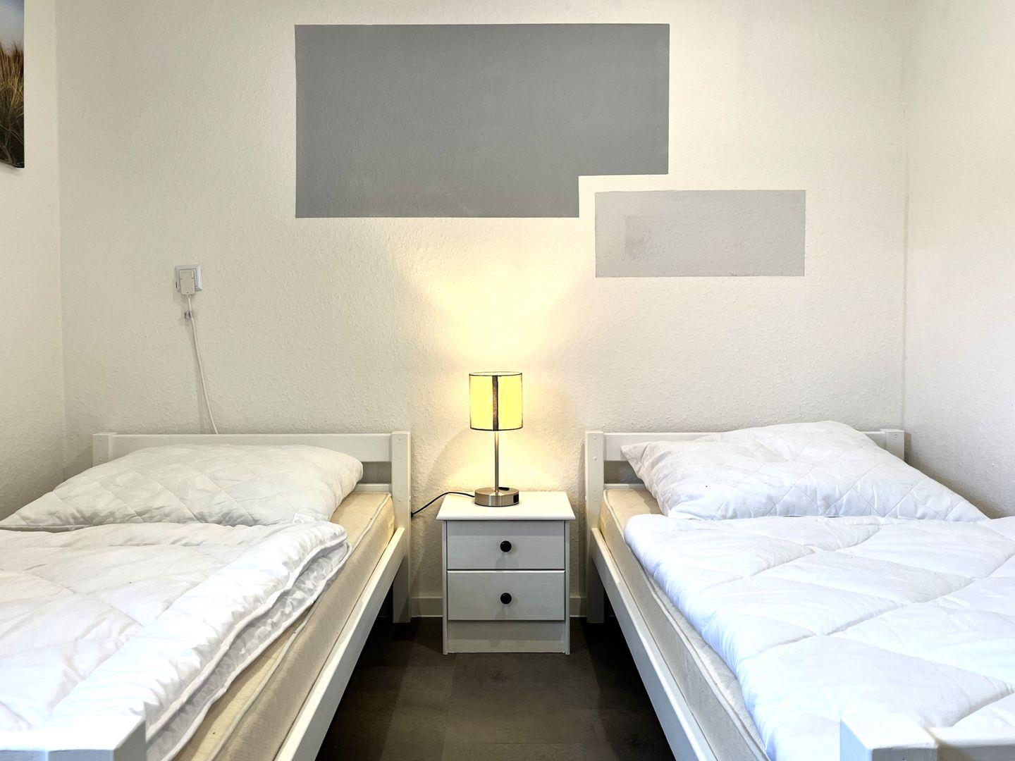 Die Ferienwohnung verfügt über zwei gemütliche Schlafzimmer, die mit komfortablen Betten und genügend Stauraum ausgestattet sind, sodass Sie erholsame Nächte genießen können. Das moderne Badezimmer bietet eine luxuriöse Regendusche, die für einen perfekten Start in den Tag sorgt.