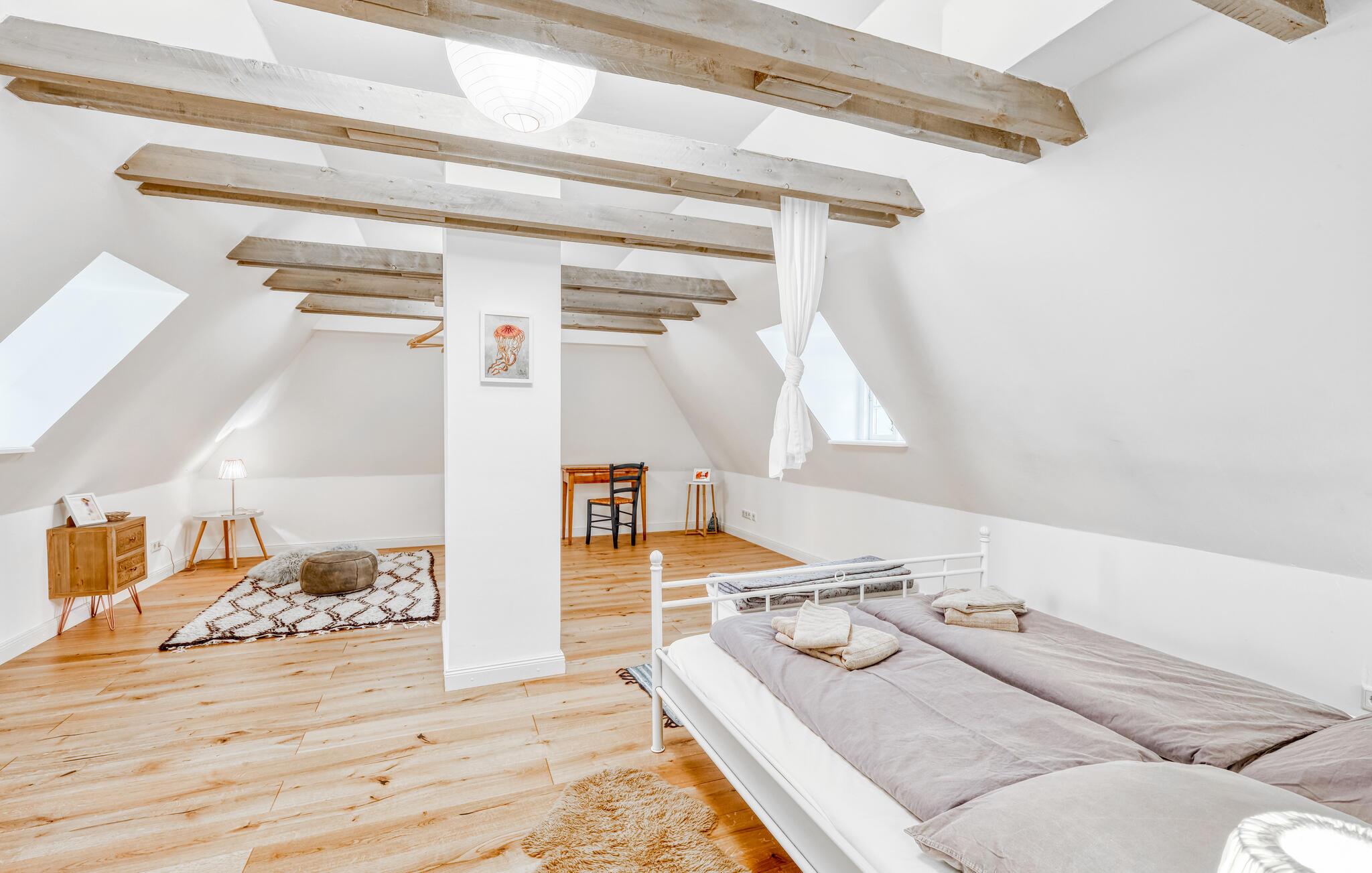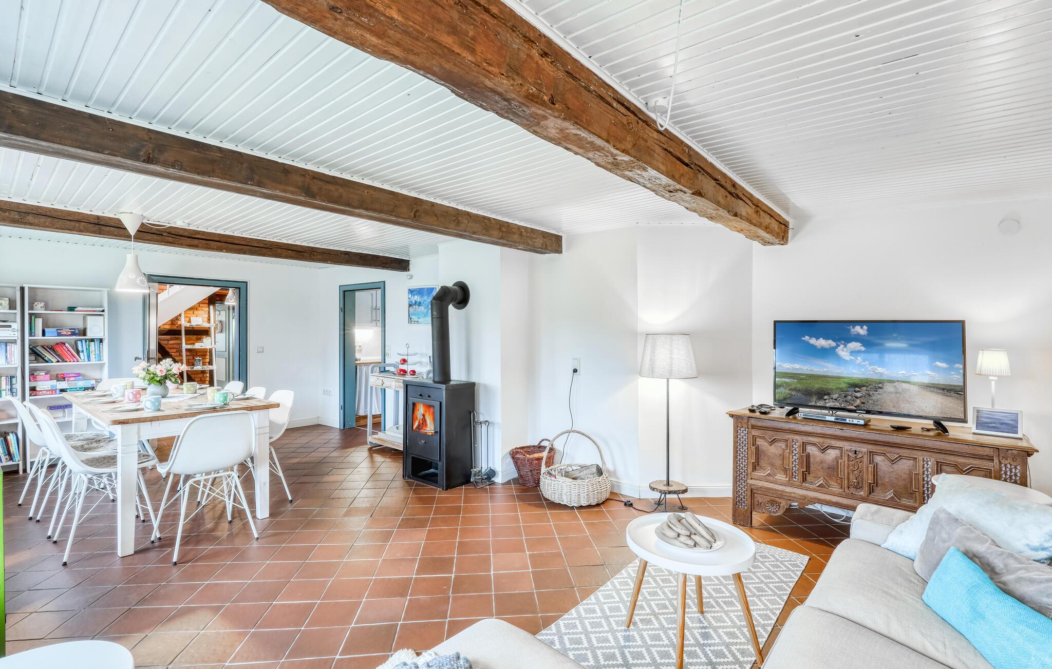 Dette sjarmerende huset med stråtak har alt du trenger for en avslappende ferie. Kombinasjonen av naturlige tregulv, terrakottafliser og gulvvarme skaper en innbydende atmosfære, mens den store stue-/spisestuen med peis skaper en ekte hyggefølelse. Det velutstyrte kjøkkenet innbyr til felles matlaging, og med flere soverom har huset nok plass til hele familien. Barna kan løpe rundt i den romslige hagen, mens du kan nyte freden og roen på terrassen - det perfekte tilfluktsstedet for å slappe av og koble av.
