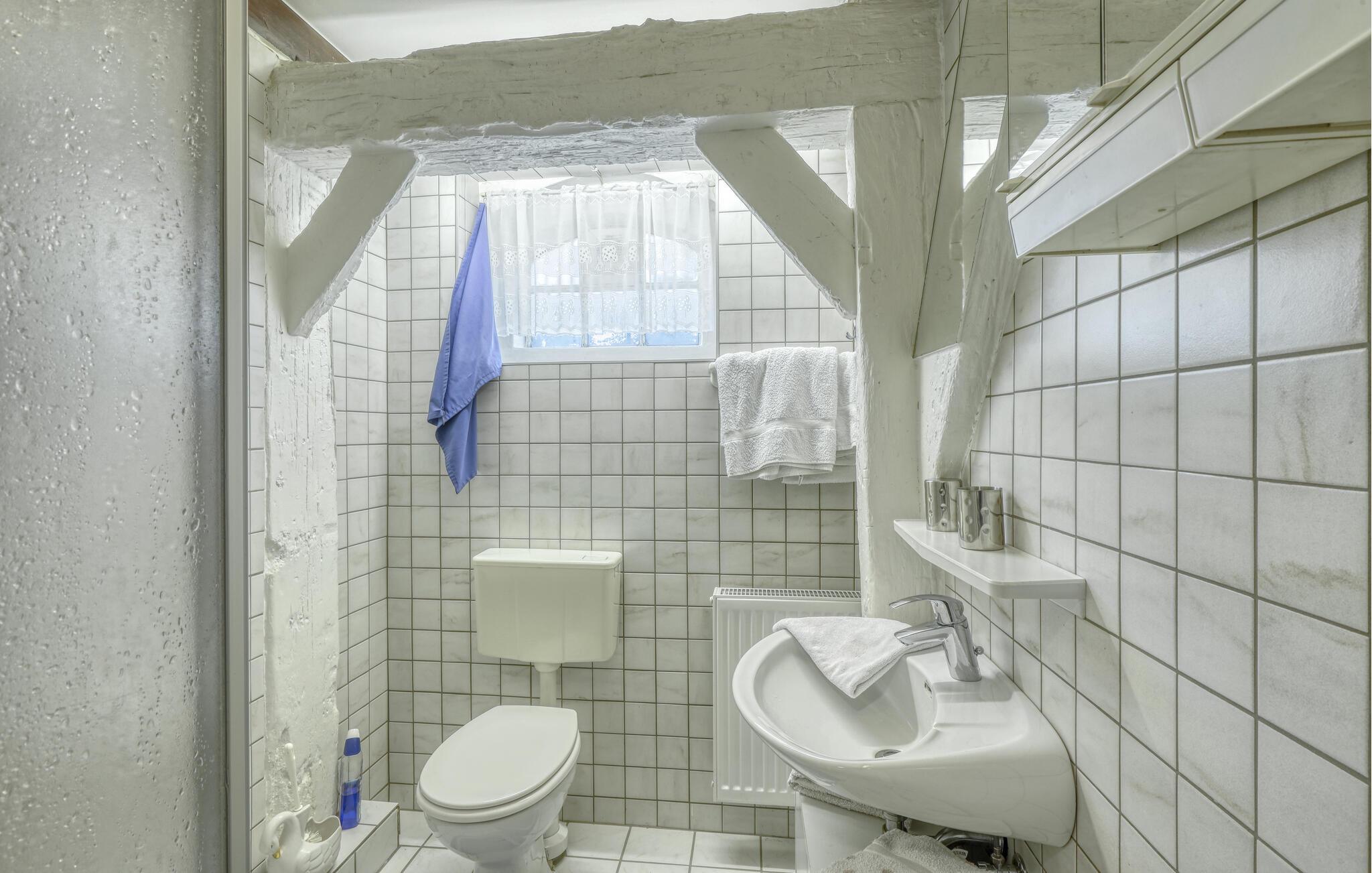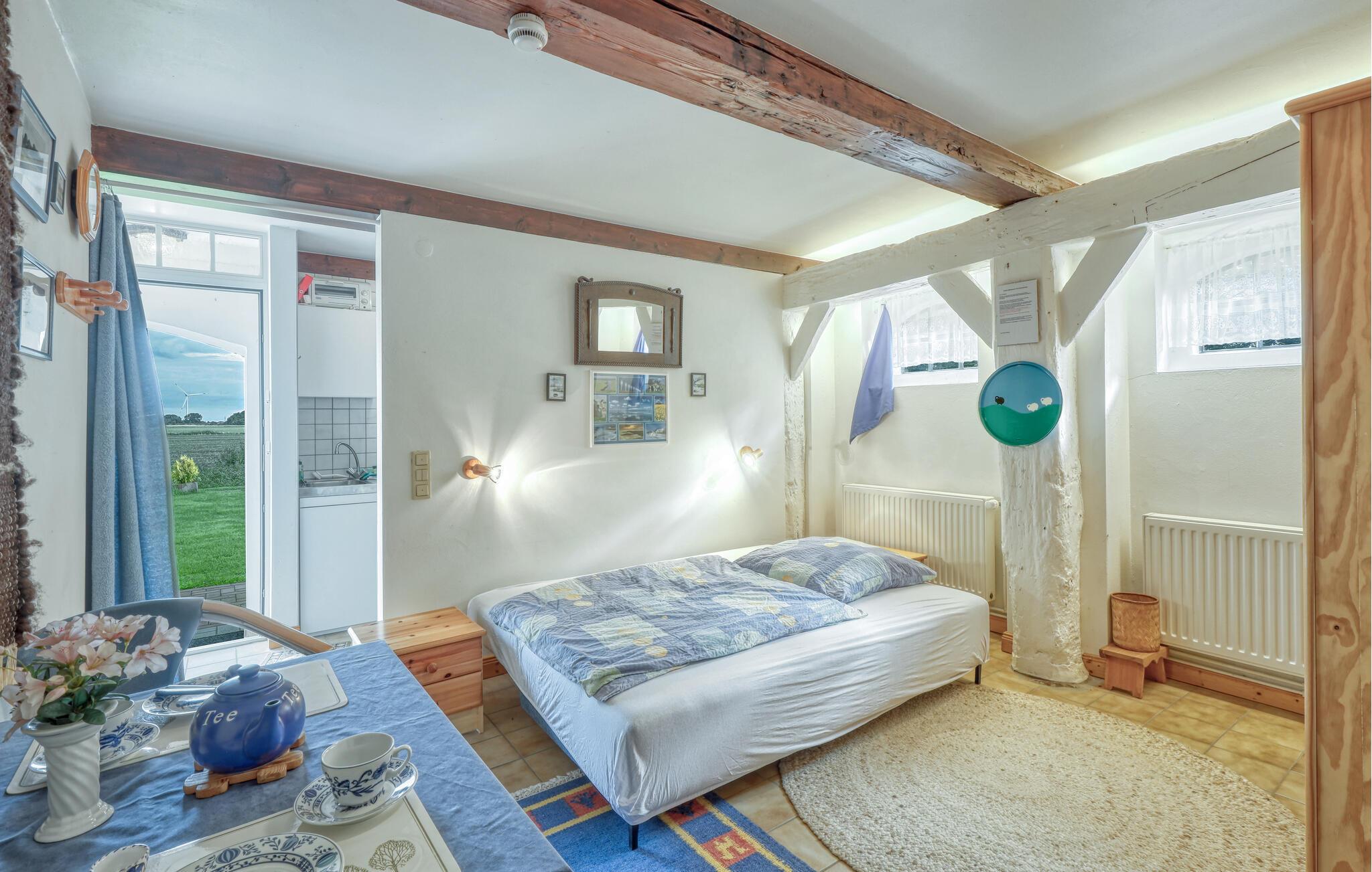 Nyt en avslappende ferie i denne koselige ferieleiligheten i første etasje med plass til én person, som kombinerer landlig ro med en tradisjonell atmosfære. Gå inn i den lyse leiligheten og føl deg straks som hjemme. Slapp av i den romslige stuen med komfortable sitteplasser, koselige møbler og en sjarmerende blanding av tradisjonelle treelementer og vennlige farger. Bruk det lille, velutstyrte kjøkkenet til å lage dine egne måltider, som du kan nyte direkte ved spisebordet.