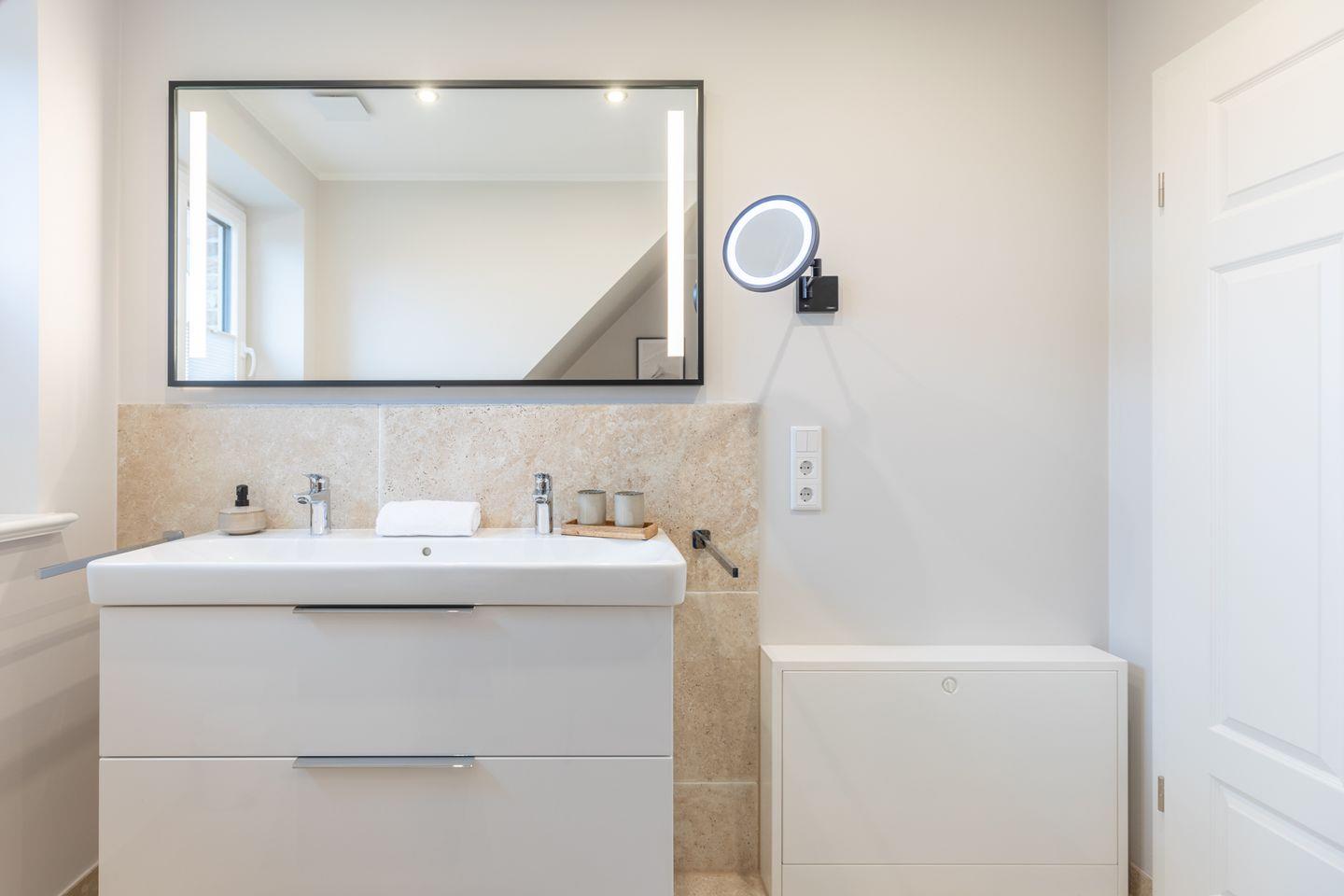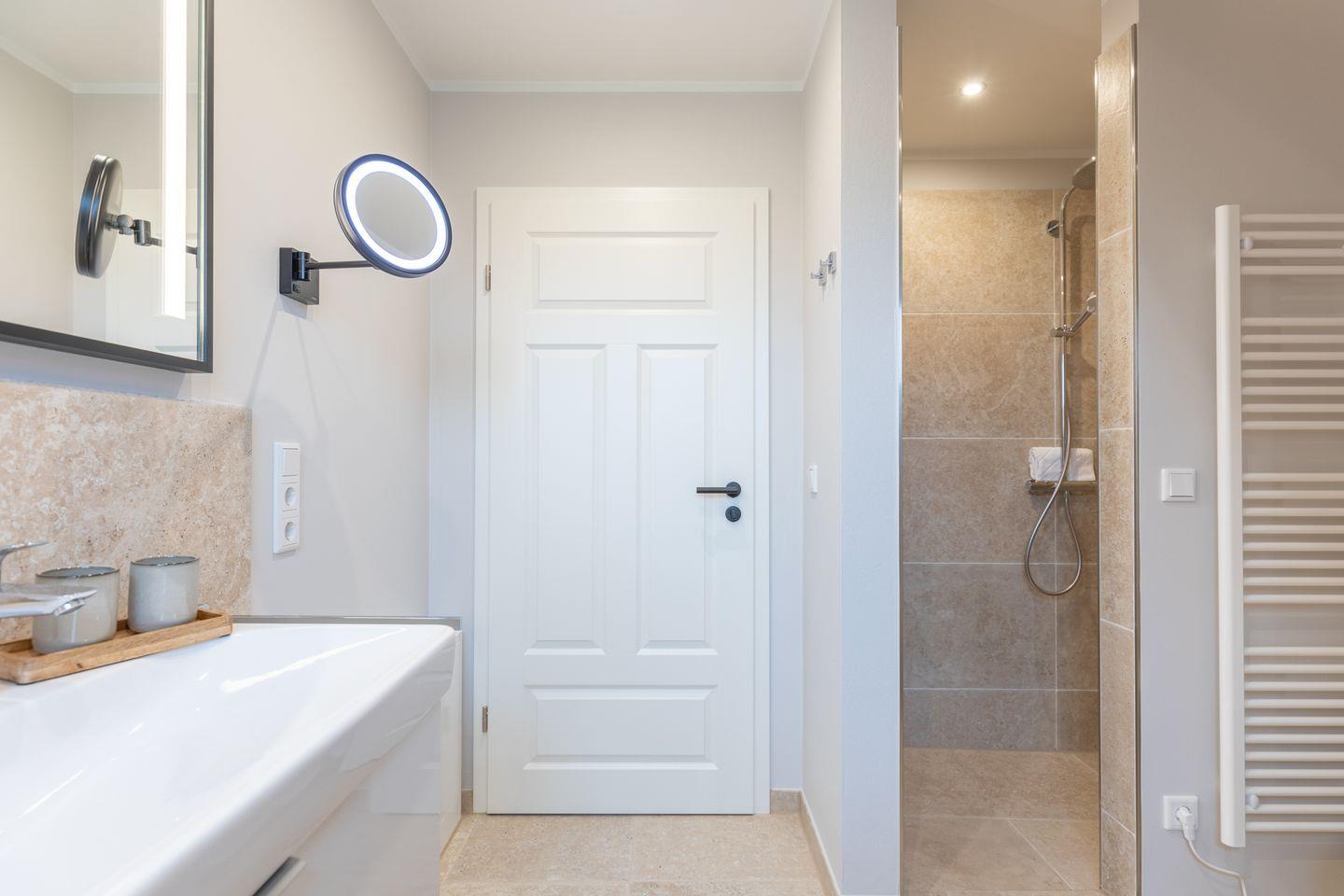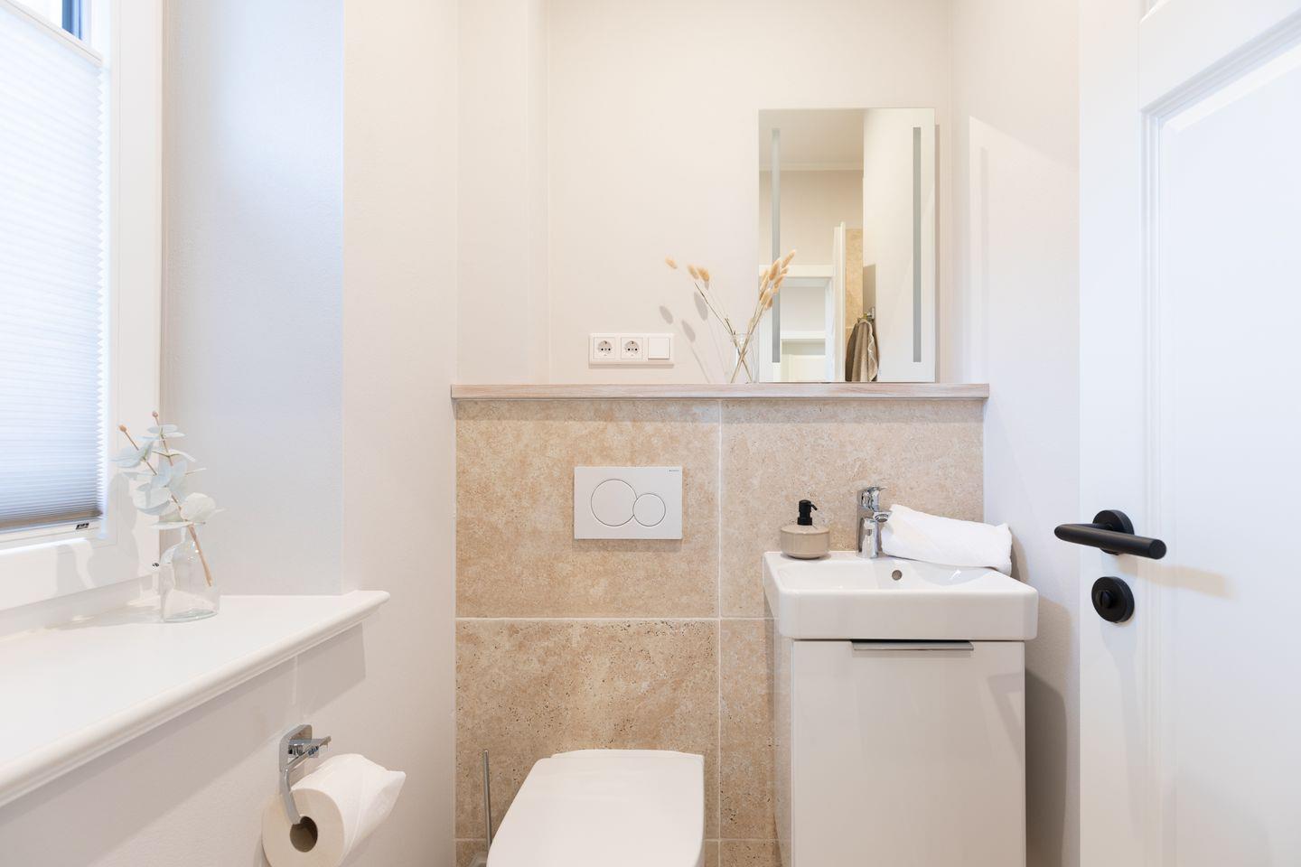 Im Erdgeschoss stehen Ihnen ein Duschbad mit ebenerdigem Zugang und ein Hauswirtschaftsraum mit Waschmaschine und einem Trockner zur Verfügung.