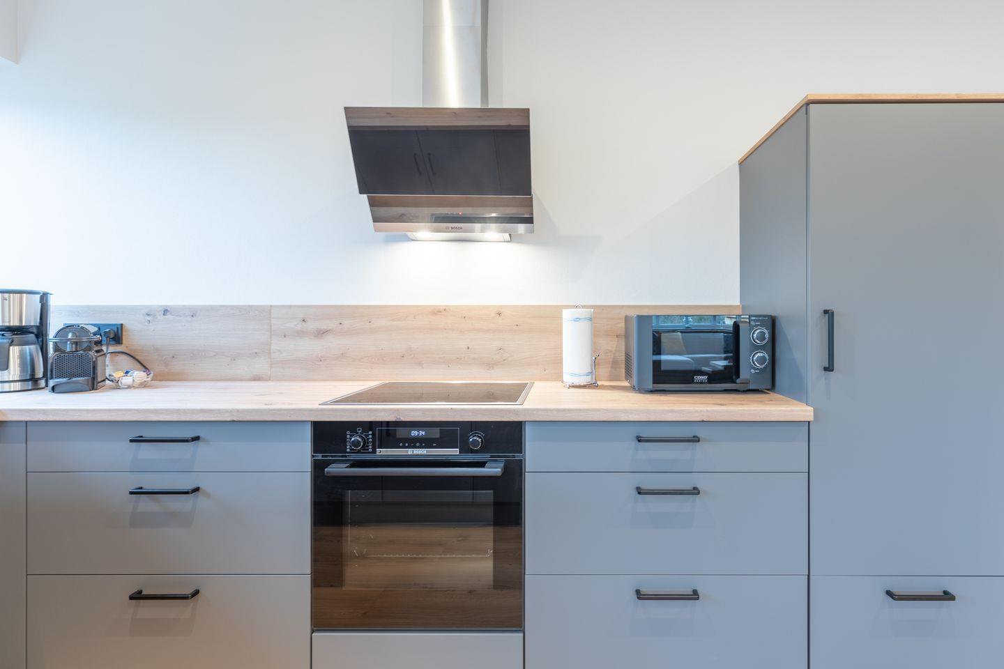 Der großzügige Wohnbereich lädt mit einer schönen Sofalandschaft (Schlafcouch) zu gemütlichen TV-Stunden ein. Die offene Küche ist sehr gut ausgestattet: Geschirrspüler, Kühlschrank, Gefrierfach, Backofen, Induktionsherd, Dunstabzugshaube, Weinkühlschrank, Nespresso-Maschine, Filterkaffee-Maschine (Filtergröße 4), Wasserkocher und ein Toaster.