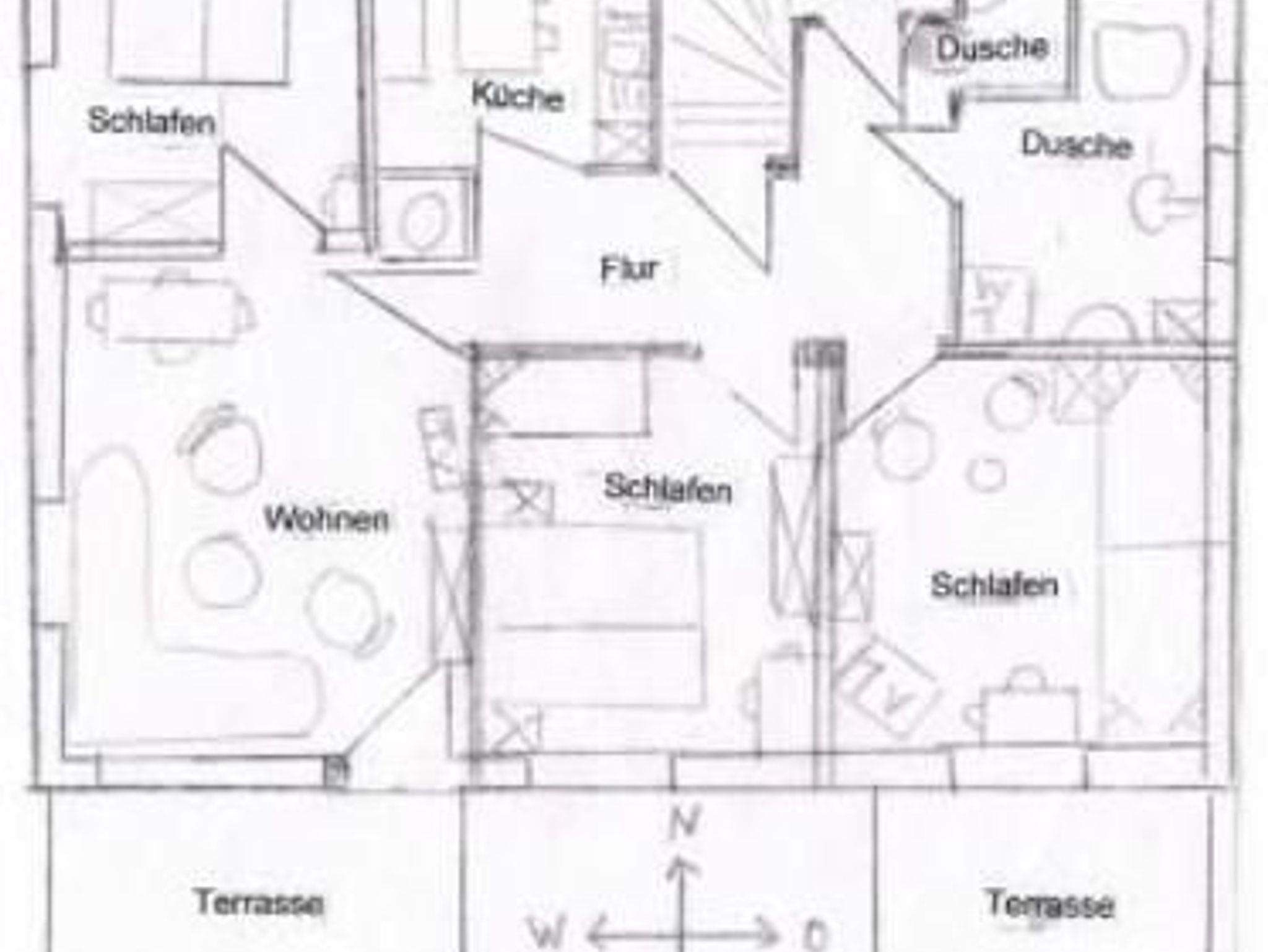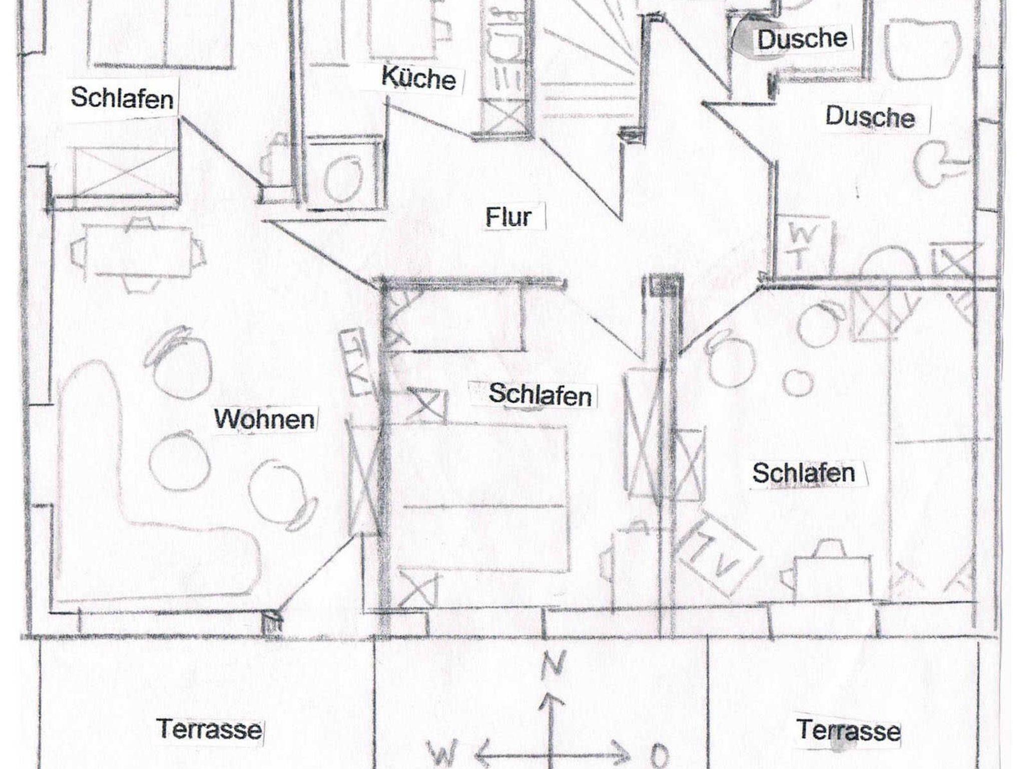 Raumaufteilung: 1 Schlafraum (2 Einzelbetten), 1 Schlafraum ( Doppelbett 2x1,80m mit übergroßen Bettdecken, 1 Babybett), 1 Schlafraum ( Doppelbett (2x2m mit übergroßen Bettdecken, 1 Babybett), 1 komb. Wohnraum mit Essplatz, 1 Wohnküche mit Sitzecke.