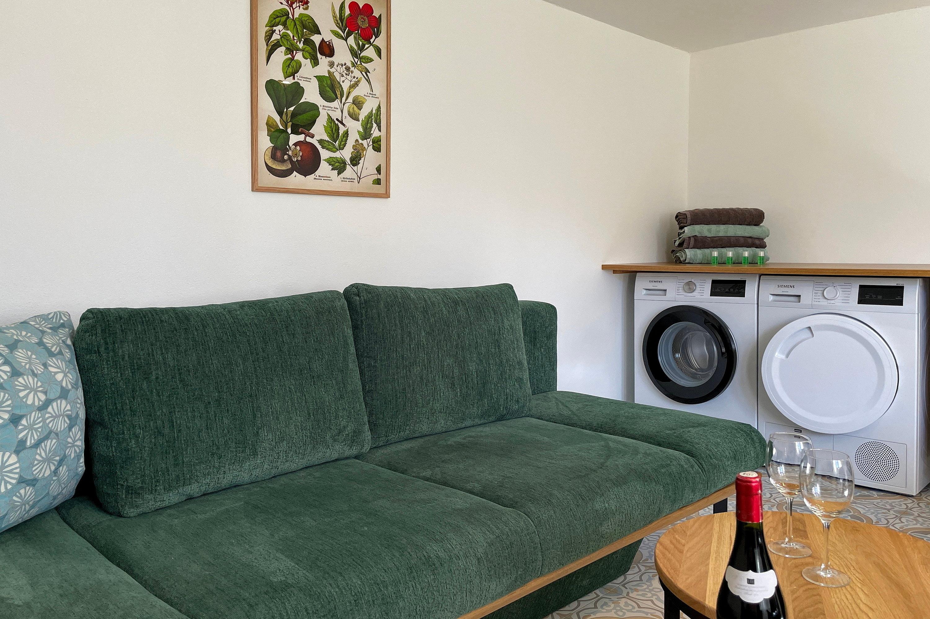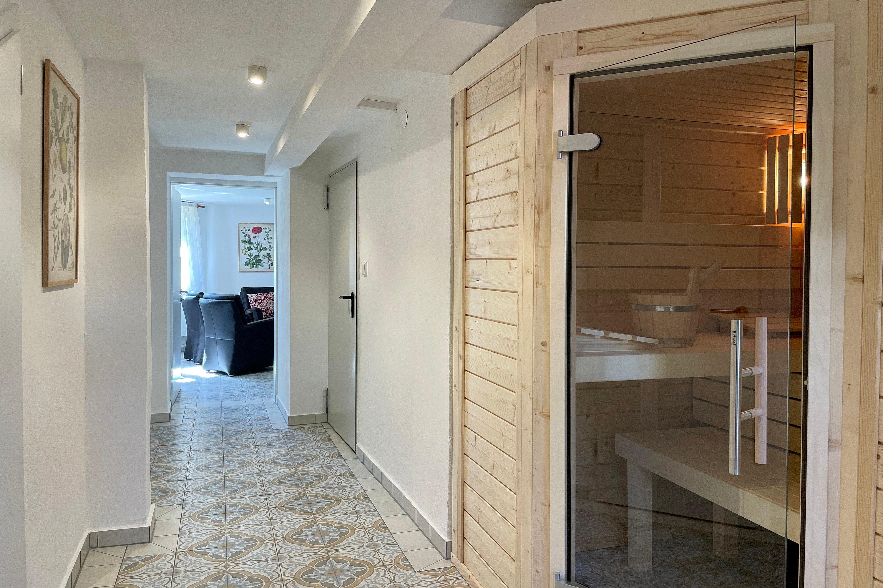 Die Wildrose bietet Gästen einen zusätzlichen Aufenthaltsraum im Keller, der von außen begehbar ist. Hier steht Ihnen ein vollwertiges Badezimmer und eine Sauna mit Aufenthaltsraum und Sitzgruppe zur Verfügung sowie die kostenfreie Nutzung von Waschmaschine und Trockner. Diese Annehmlichkeiten erhöhen den Komfort und die Flexibilität während ihres Aufenthalts.