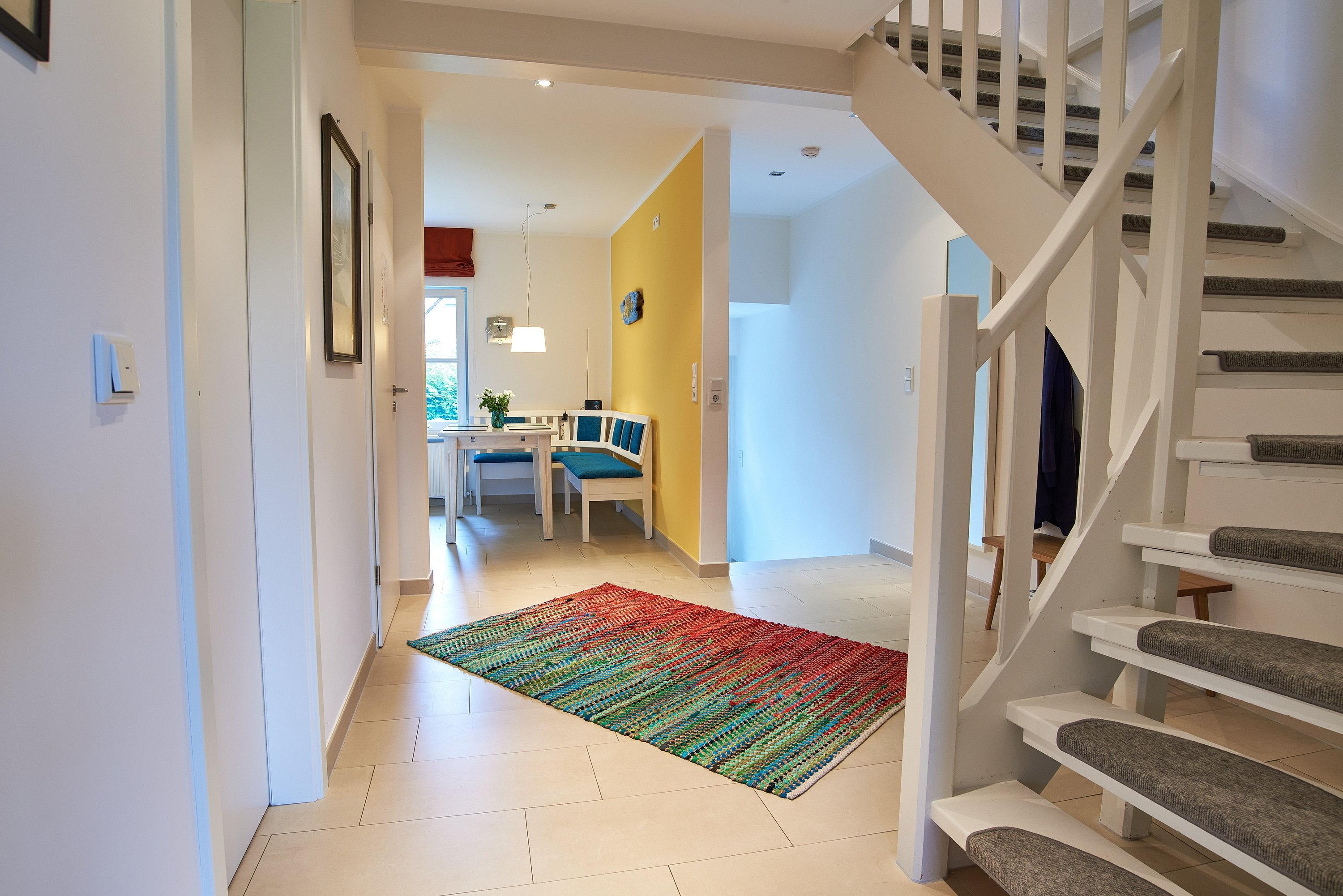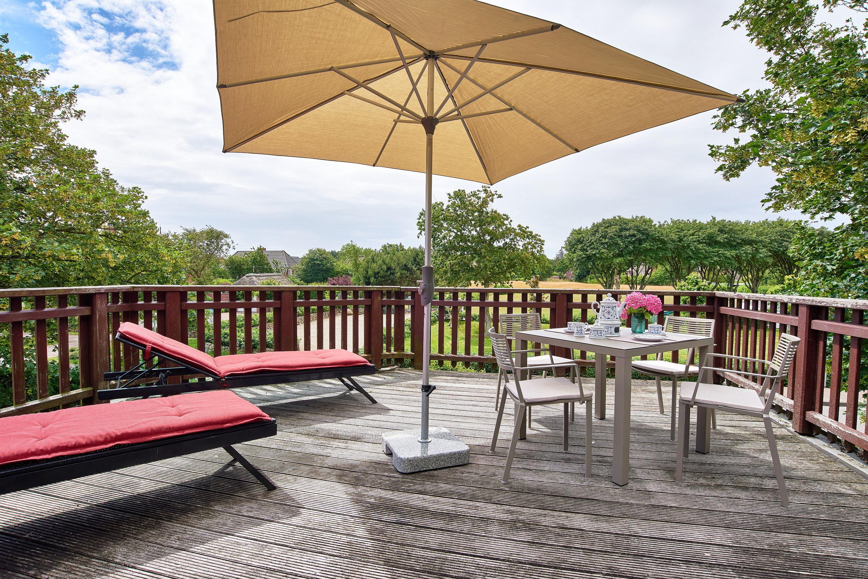 Mitten im Herzen des wunderschönen und idyllischen Ortes Nieblum, welcher unter vielen Liebhabern der Insel als schönster Ort auf Föhr gilt, befindet sich dieses Juwel nur wenige Meter entfernt vom schön angelegten und gepflegten Nieblumer Ententeich. Nieblum ist ein kleines Inseldorf, nur ca. 5 Km von der Stadt Wyk entfernt und bietet alles, was man zum täglichen Bedarf benötigt. Es gibt einen kleinen Einkaufsladen, eine Bäckerei mit hervorragenden Brötchen, Broten und süßen Gaumenfreuden, mehrere Restaurants und Cafés, eine unter den Föhrern sehr beliebte Eisdiele und natürlich einen schönen Strand mit Surfschule. Und genau in diesem hübschen Dorf liegt unsere Haushälfte Wildrose mit seinen 65 qm. Schon beim Betreten des Hauses werden Sie die offene und großzügige Bauweise der Doppelhaushälfte bemerken. Der geräumige Flur bietet reichlich Platz und von hier führt eine Treppe hinauf in den Schlafbereich, welcher mit der offenen Balkenlage, den dunklen, edlen Möbeln im Kontrast zum hell gestalteten Raum sogleich Gemütlichkeit ausstrahlt. Zugleich befindet sich im Schlafraum neben dem Boxspringbett (160x200cm) eine weitere Sitzgruppe zum Lesen, Fernsehschauen, Telefonieren oder einfach zum Entspannen und Zurückziehen. Von hier aus gelangen Sie auch auf die große Dachterrasse, die im Sommer (ca. April bis Ende September Anfang Oktober) mit Gartenmöbeln zum Verweilen einlädt.