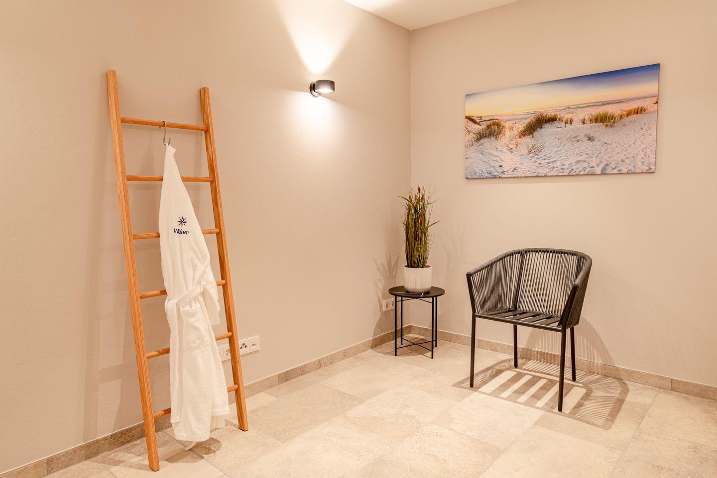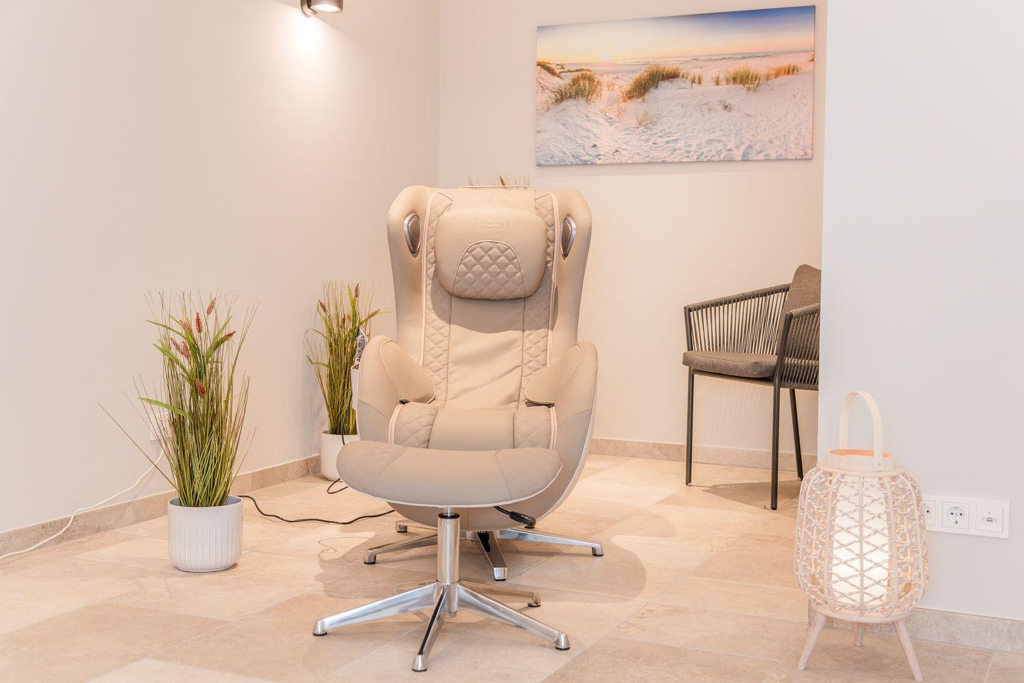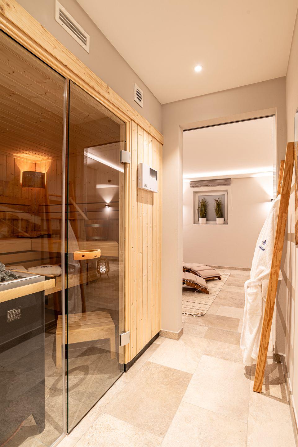 Im Souterrain befindet sich die hauseigene Sauna mit eigenem Duschbad und angrenzendem Ruheraum. Ein Desiger-Massagesessel von der Firma "iRest" steht Ihnen ebenfalls zur Verfügung.