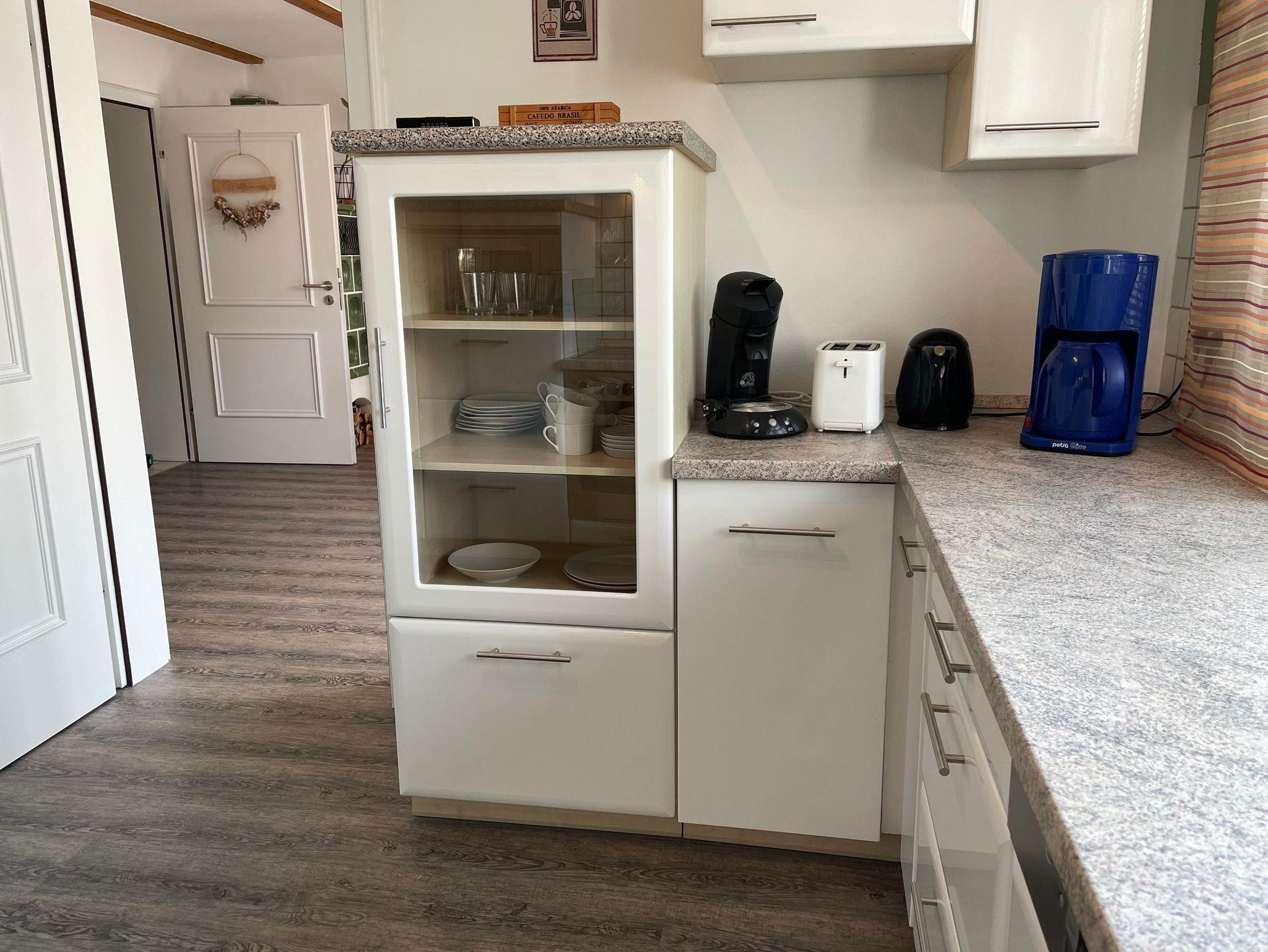Die Küche der Ferienwohnung ist etwa 12m² groß, ein kleiner Abstellraum von 3 m² befindet sich direkt nebenan. In der Küche finden sie eine umfangreiche Ausstattung für ihre individuellen Kocherlebnisse. Kühlschrank, E-Herd, Mikrowelle, Dunstabzug und Spülmaschine sind selbstverständlich.