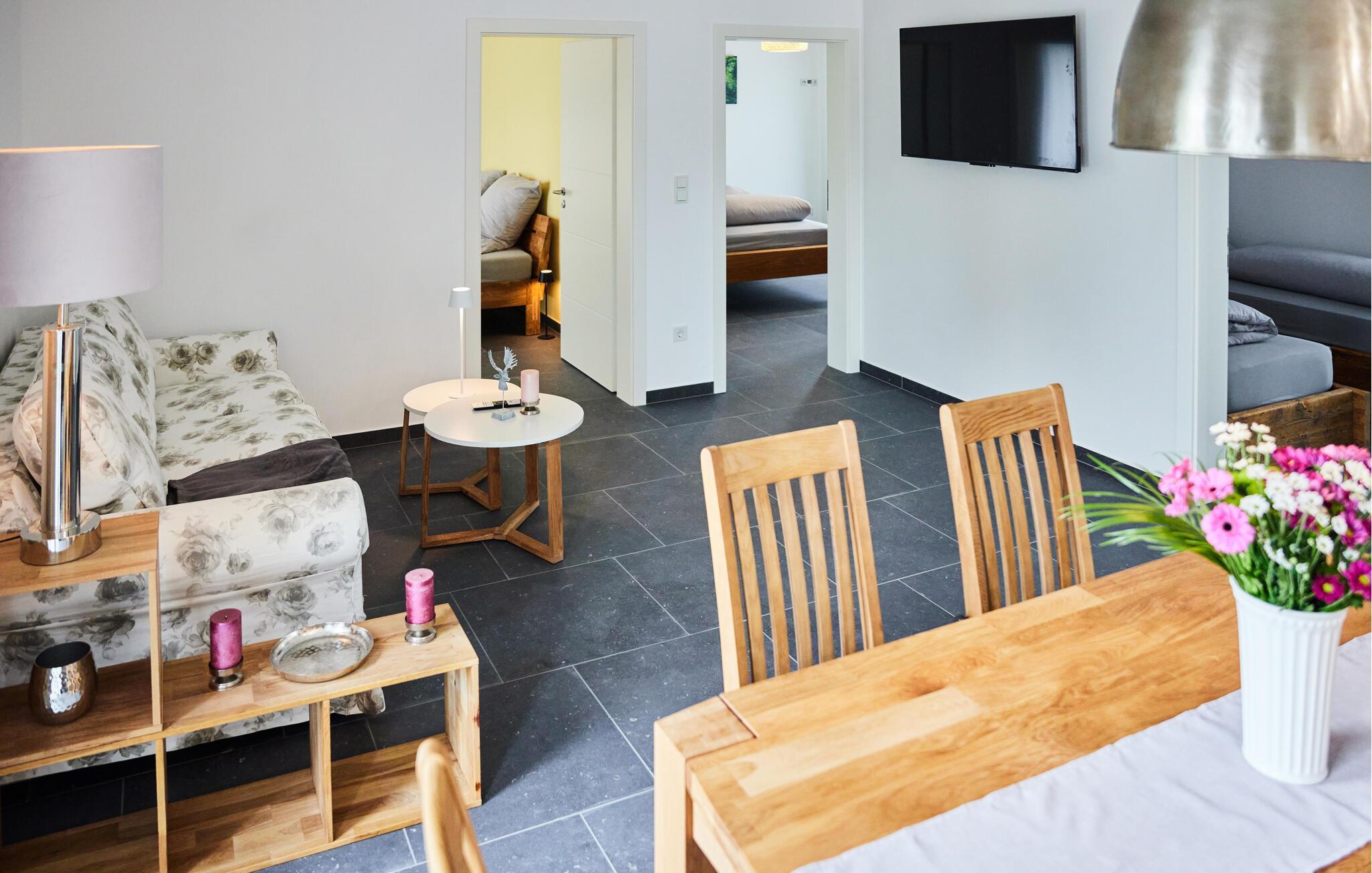Opplev ren avslapning i denne moderne og stilfulle ferieleiligheten. Den elegante kombinasjonen av mørke fliser og tremøbler av høy kvalitet skaper en harmonisk atmosfære som inviterer deg til å føle deg som hjemme. De lyse rommene i første etasje gir deg god plass til å slappe av. Nyt den åpne terrassen med en fantastisk utsikt over landskapet. Tilgang til bekken og en bålskål i hagen gir deg spesielle øyeblikk i naturen. Perfekt for koselige kvelder i det fri.