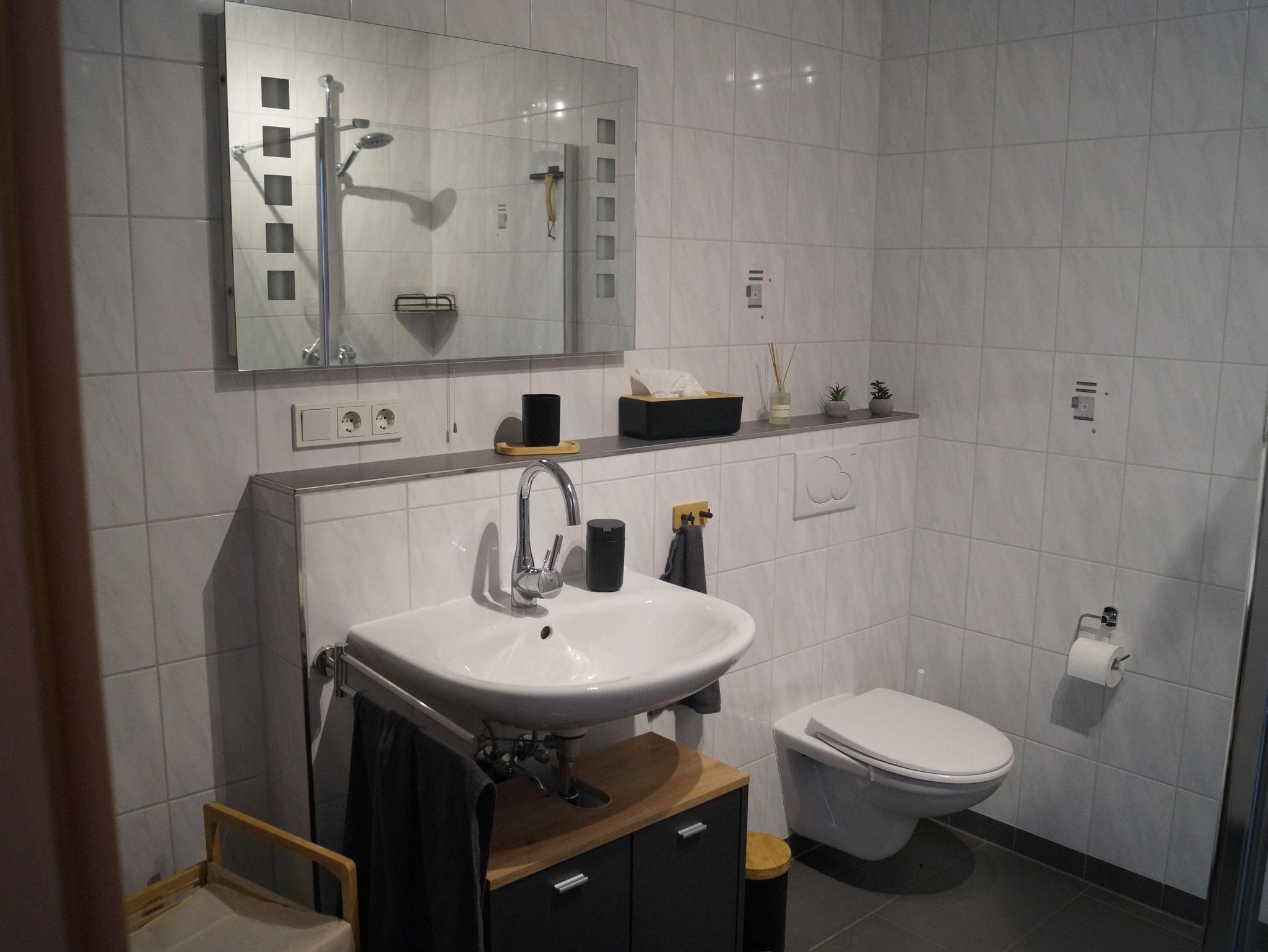Das Badezimmer hat eine ebenerdige Dusche desweiteren steht eine Waschmaschine und Trockner zur Verfügung.