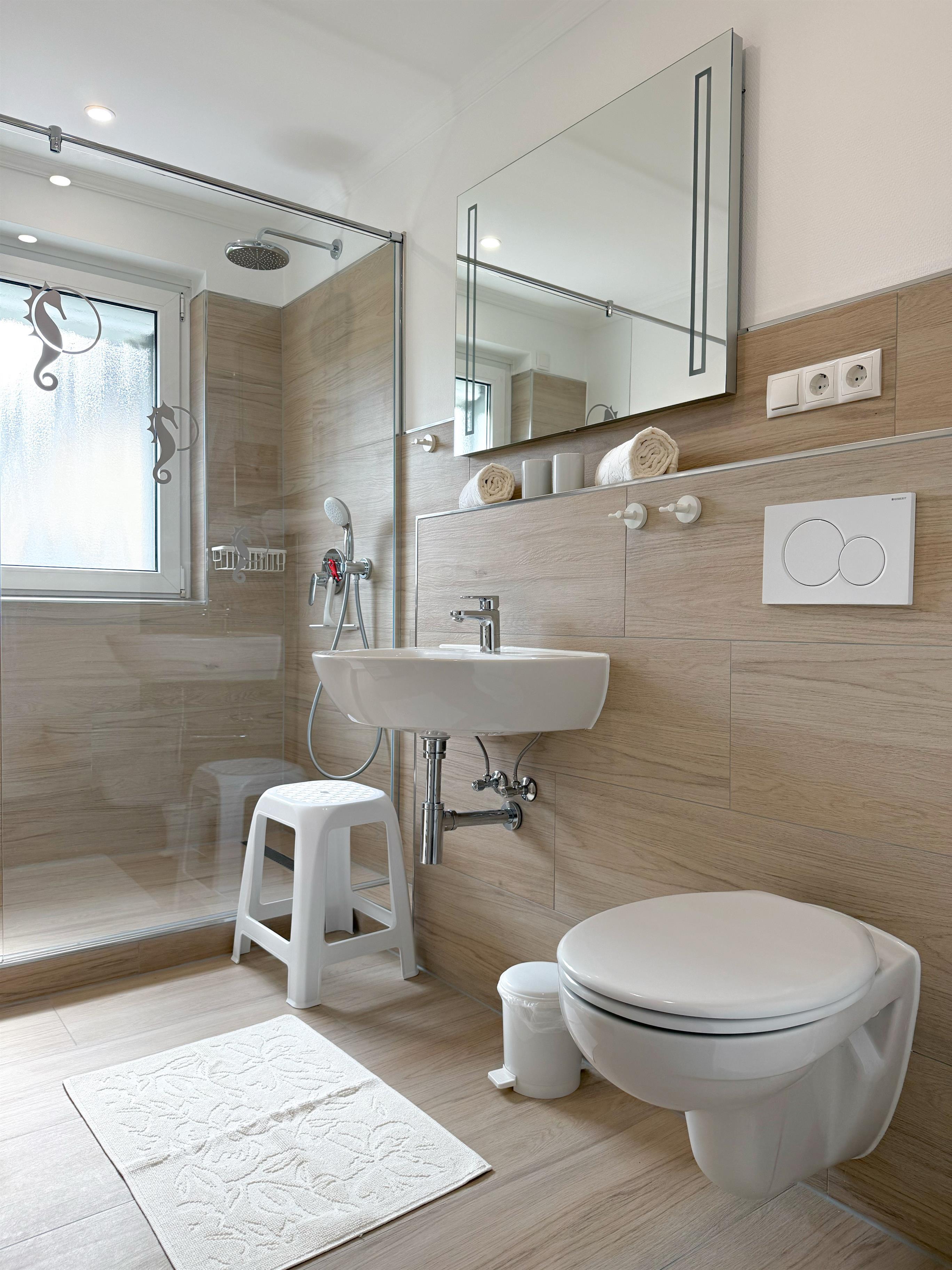 Bad mit geräumiger Dusche und Glasabtrennung ( DUSCHHANDTÜCHER bitte mitbringen),