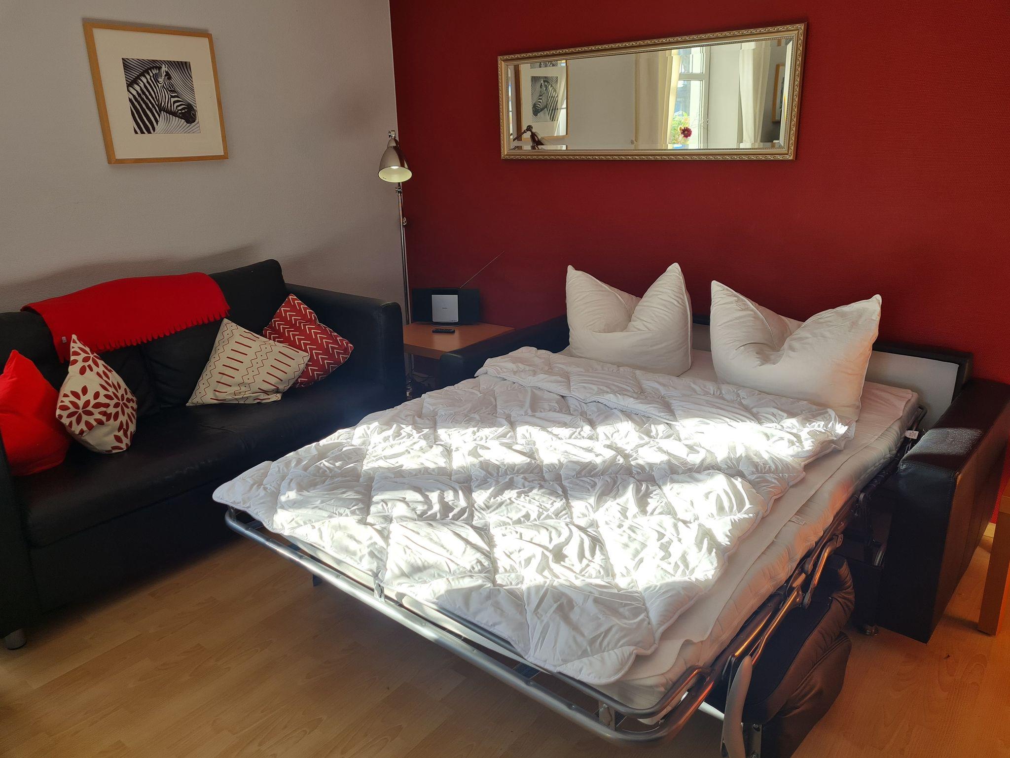 • Wohnzimmer: 2 Couchen davon eine Schlafcouch aus Leder 140x200cm mit Matratze, Smart-TV, Schrank, Sideboard, 2 Sessel, Tisch, Radio mit CD mit Bluetooth, Leselampe
