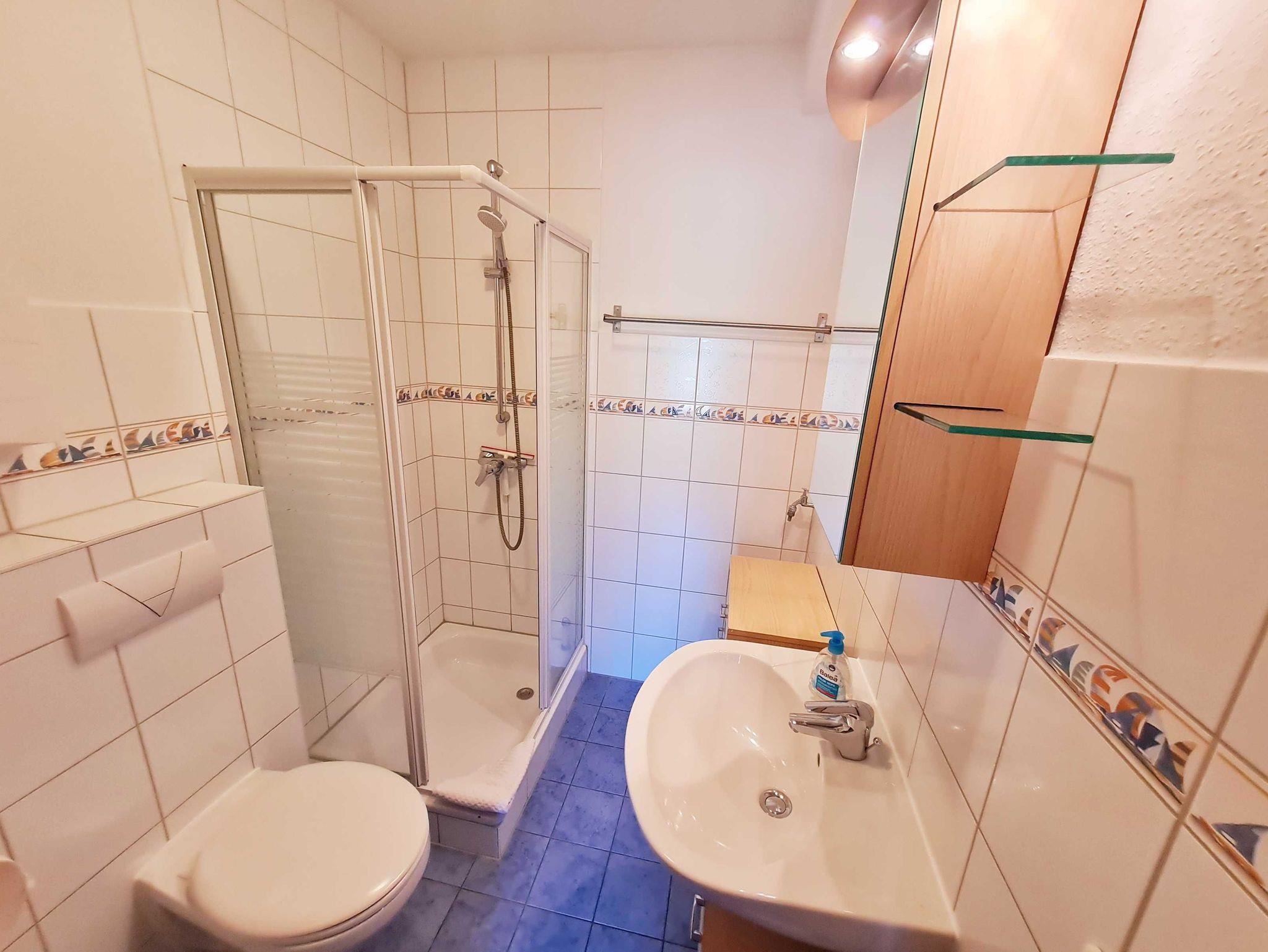 • Bad: ohne Fenster, Dusche, Waschbecken, Toilette, Spiegelschrank, Unterschrank Waschbecken, Tritt für Kinder