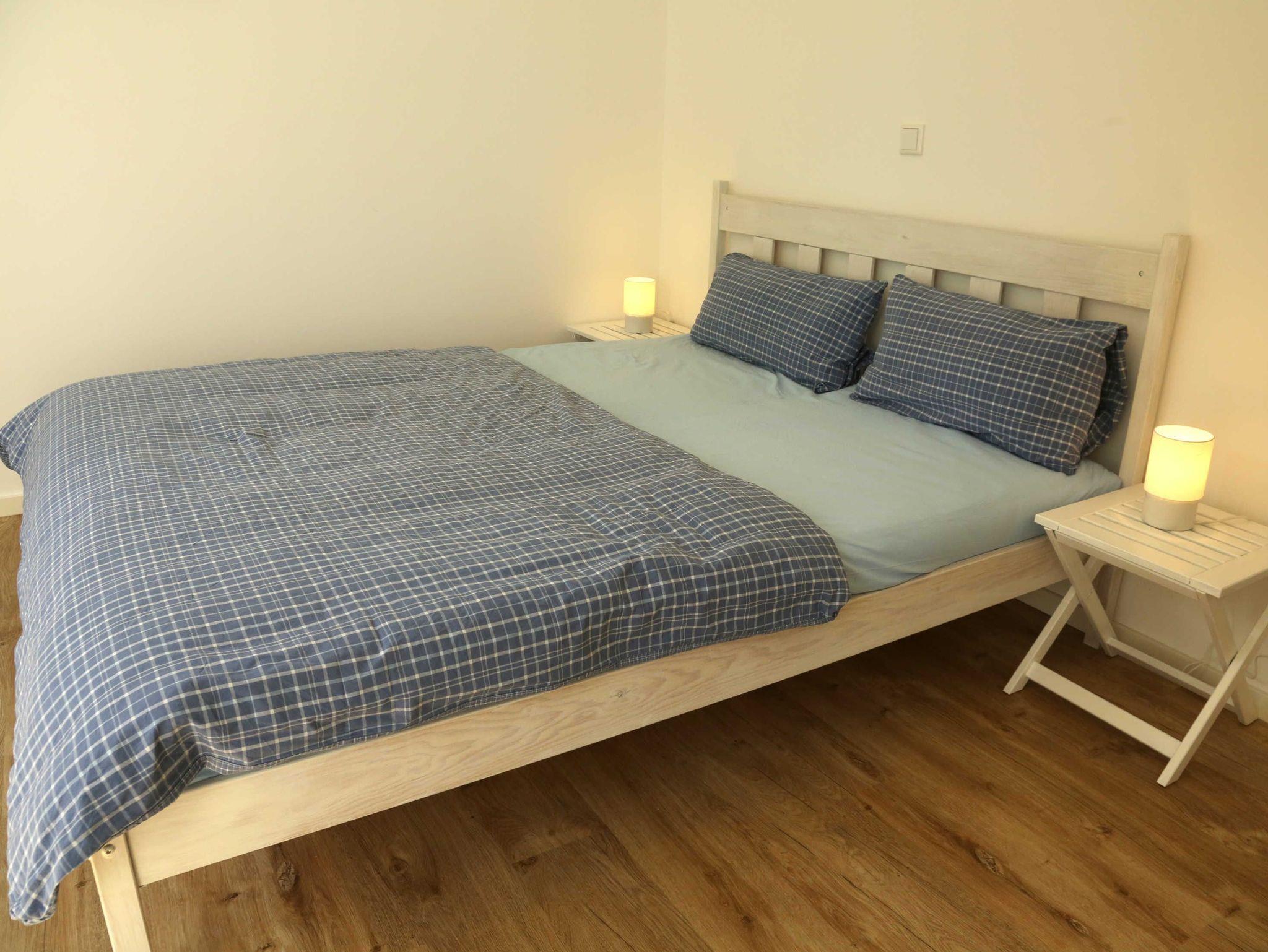Das Schlafzimmer ist mit einem Doppelbett in der Größe 160cm x 200cm ausgestattet.
