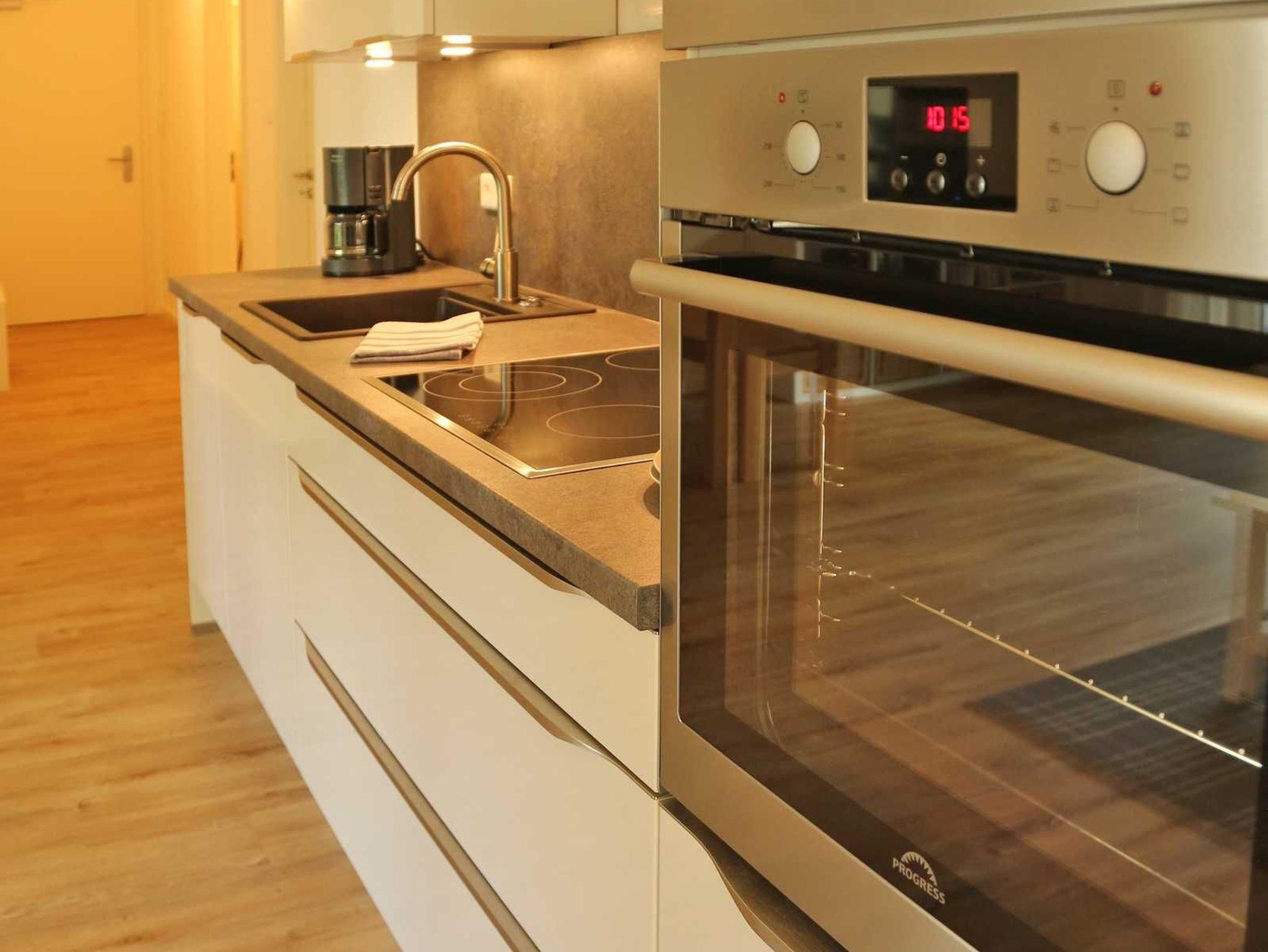 Unsere Ferienwohnung haben wir mit einer hochwertigen, offenen Wohnküche mit zahlreichen Küchenutensilien ausgestattet.