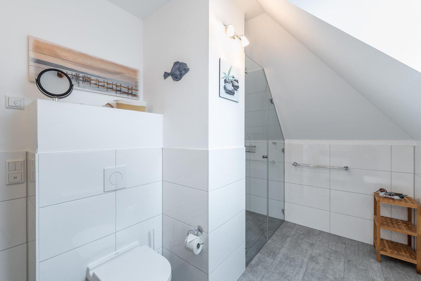 Das Bad mit Tageslicht verfügt über eine großzügige und ebenerdige Dusche, ein