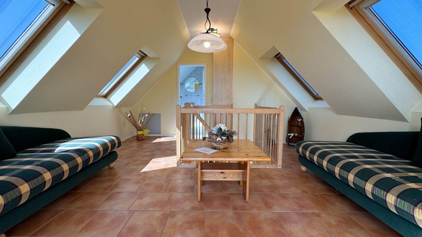 Im Dachgeschoss befinden sich zwei Einzelbetten (Polsterliegen) und ein Bad mit