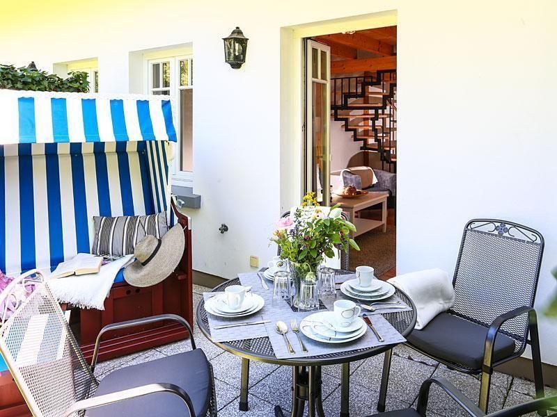 Genießen Sie das Ostsee-Feeling mit der ganzen Familie auf der romantisch anmutenden Terrasse, die Ihnen einen fantastischen freien Blick auf die Ruhe ausstrahlende Umgebung mit weitläufigen Rasenflächen, die das Ferienhaus umfassen, bietet. Moderne Gartenmöbel und ein hübscher Strandkorb laden zum gemütlichen Verweilen ein und vervollständigen das harmonische Ambiente im Außenbereich des Hauses.