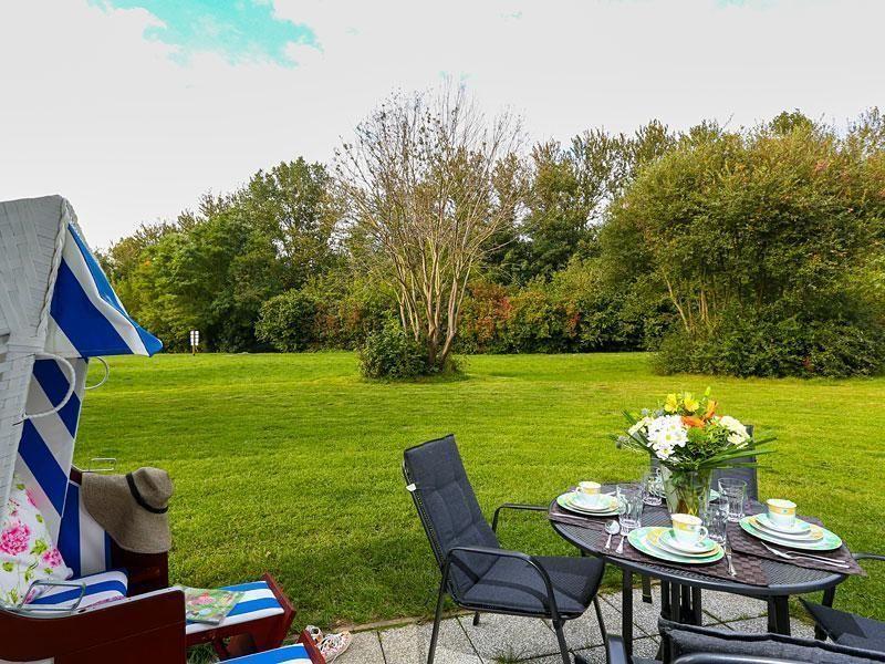 Genießen Sie das Ostsee-Feeling mit der ganzen Familie auf der romantisch anmutenden Terrasse, die Ihnen einen fantastischen freien Blick auf die Ruhe ausstrahlende Umgebung mit weitläufigen Rasenflächen, die das Ferienhaus umfassen, bietet. Moderne Gartenmöbel und ein hübscher Strandkorb laden zum gemütlichen Verweilen ein und vervollständigen das harmonische Ambiente im Außenbereich des Hauses.
