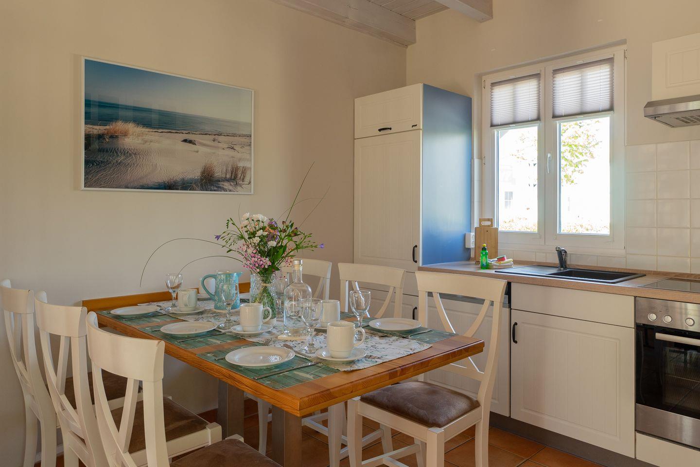 Die moderne, voll ausgestattete Einbauküche lässt keine Wünsche offen: 4-Felder-Herd, Backofen, Kühlschrank inkl. Gefrierfach, Geschirrspüler und Mikrowelle. Hier ist alles vorhanden, um Ihre Lieblingsgerichte im Handumdrehen zuzubereiten. Gemeinsam speisen Sie am großzügigen Esstisch für 5 Personen, der nahtlos in den Wohnbereich integriert ist – gesellige Abende sind garantiert.