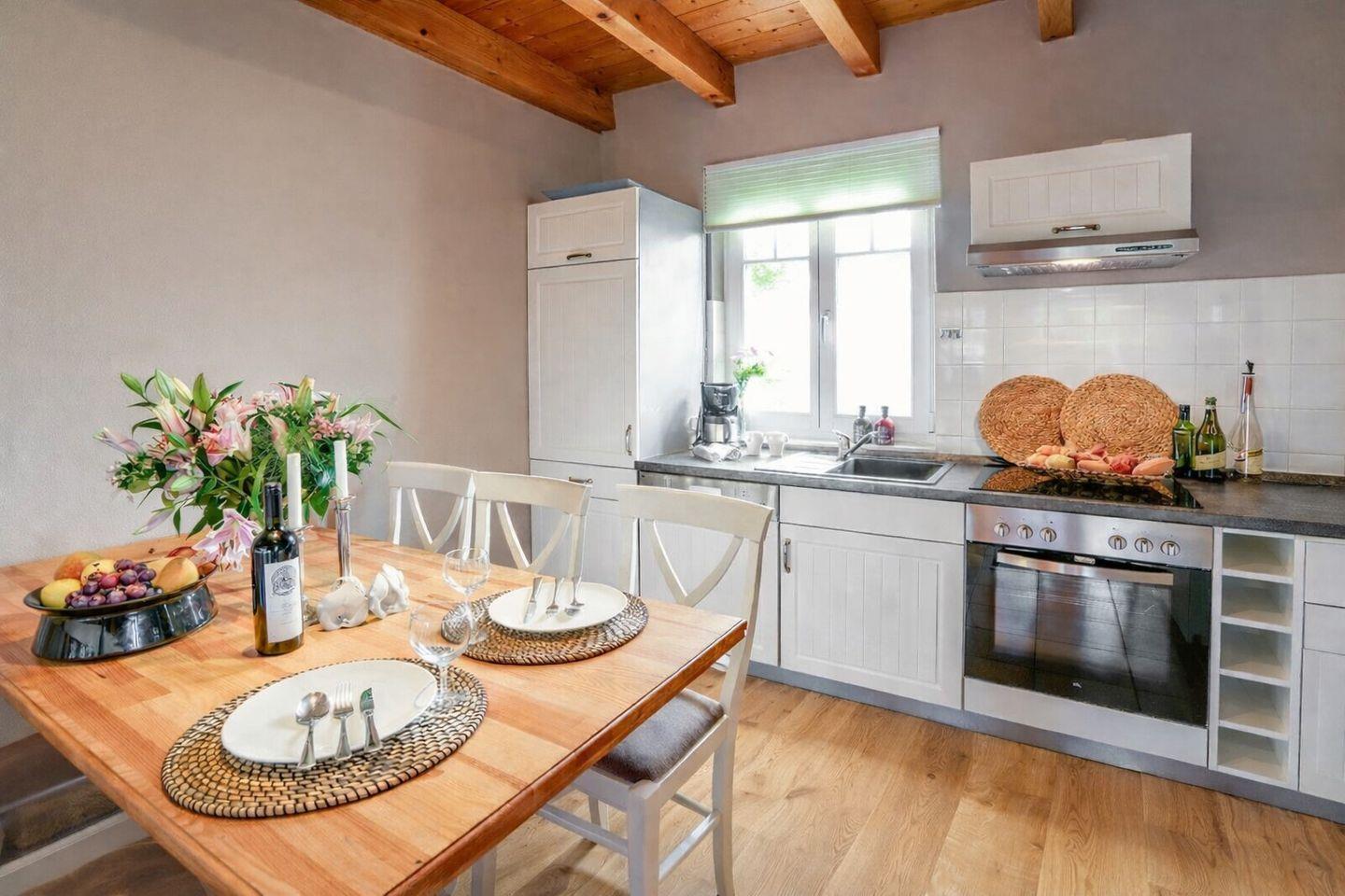 Die moderne, voll ausgestattete Einbauküche lässt keine Wünsche offen: 4-Felder-Herd, Backofen, Mikrowelle, Kühlschrank inkl. Gefrierfach und Geschirrspüler. Hier ist alles vorhanden, um Ihre Lieblingsgerichte im Handumdrehen zuzubereiten. Gemeinsam speisen Sie am großzügigen Esstisch für 6 Personen, der nahtlos in den Wohnbereich integriert ist – gesellige Abende sind garantiert.