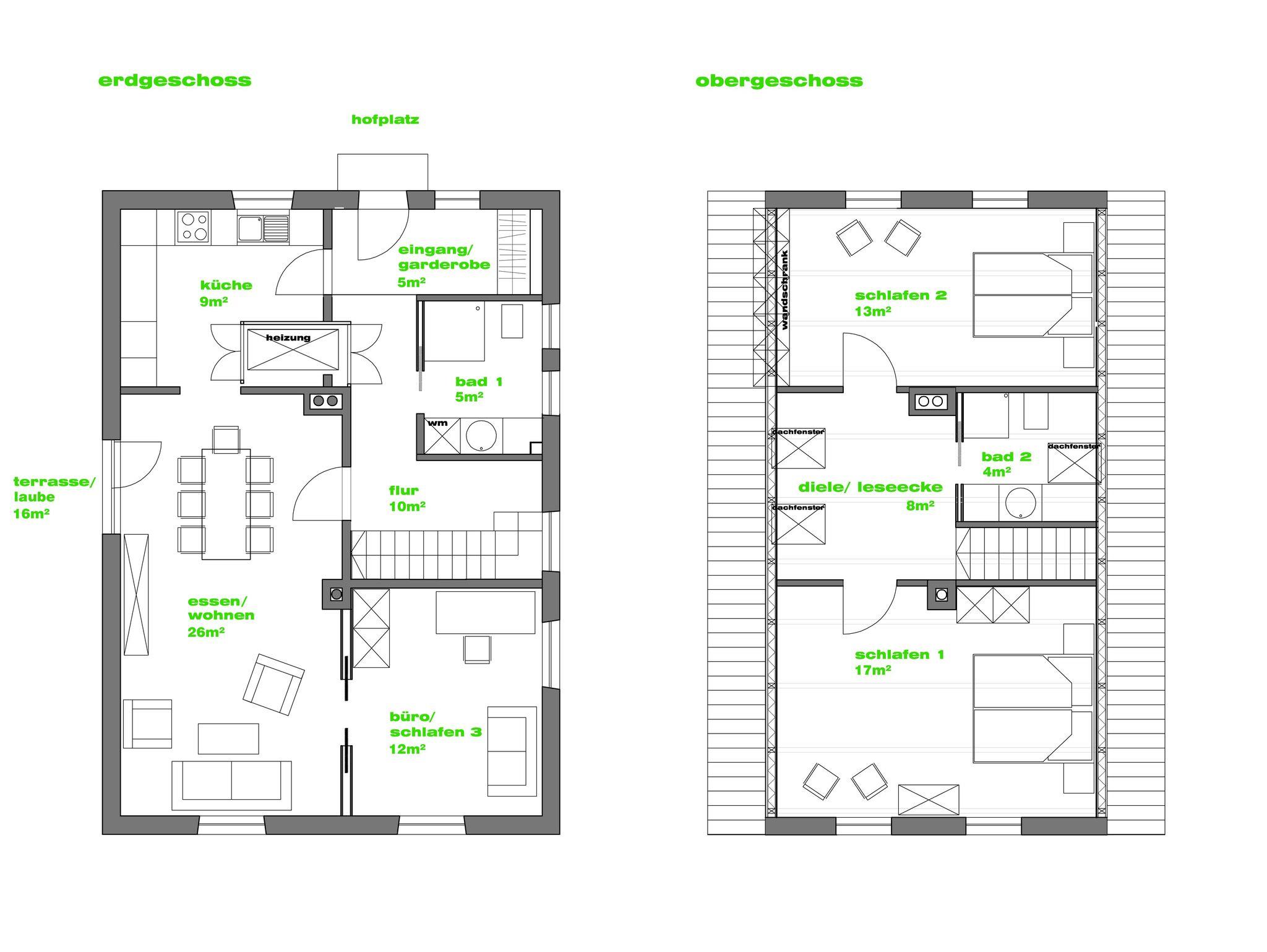 Über die Treppe ins Obergeschoss gelangt man in einen Aufenthaltsraum, in den man sich zum Spielen und Lesen zurückziehen kann. Das Obergeschoß ist bis unter den Giebel geöffnet - dadurch wirken die geräumigen Zimmer noch großzügiger und die sichtbare Konstruktion macht die Räume sehr gemütlich.