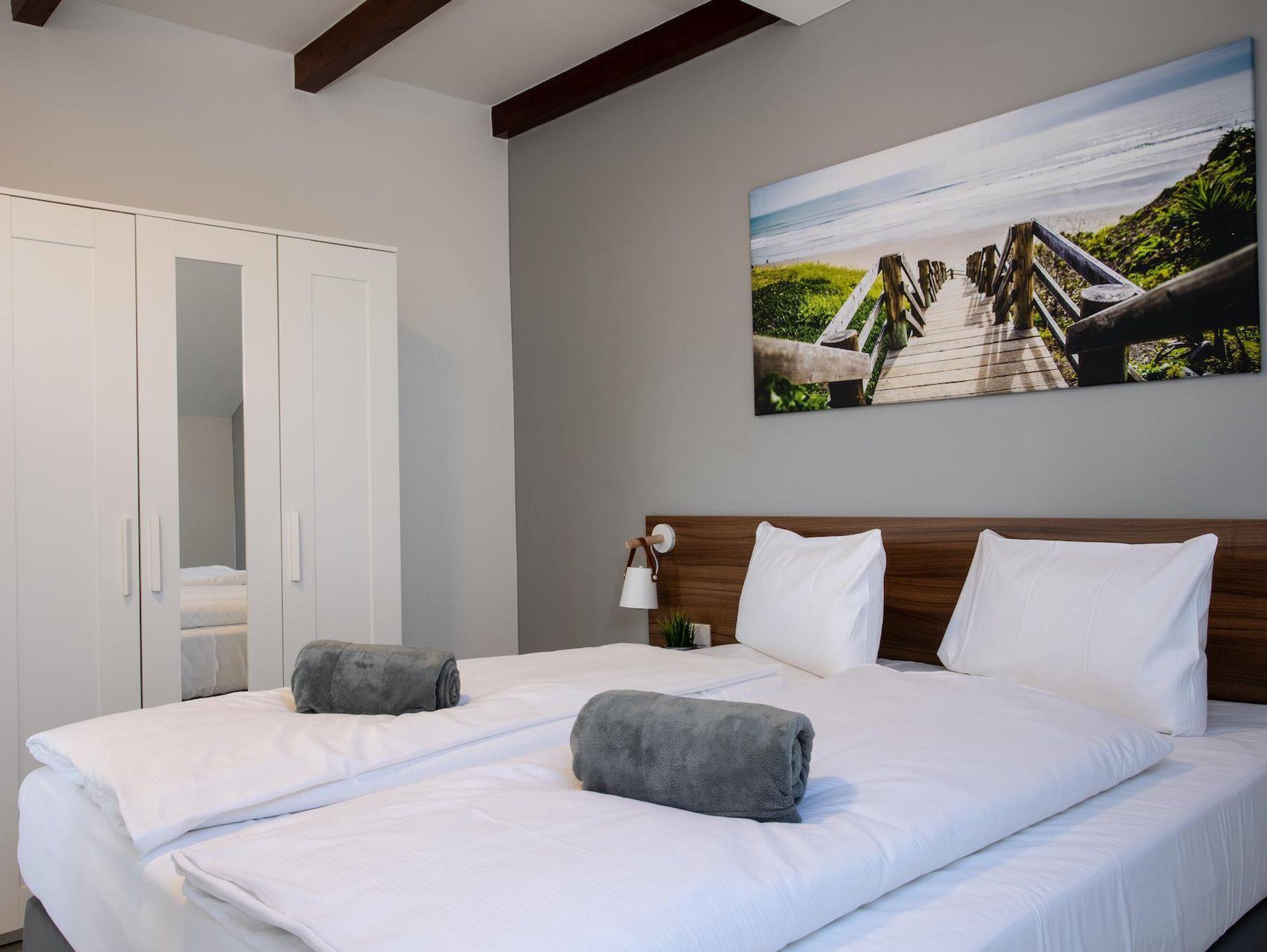 Mit der perfekten Mischung aus Hotelzimmer-Komfort und gemütlichem Wohnraum, der keine Wünsche offen lässt, verfügt dieses Apartment über einen großzügigen Balkon, der von beiden Zimmern aus erreichbar ist. Mit dem modernen Bad mit ebenerdiger Dusche und separatem Schreibtisch ist dieses Apartment sowohl für urlaubssuchende Paare, wie auch Geschäftsreisende perfekt geeignet.