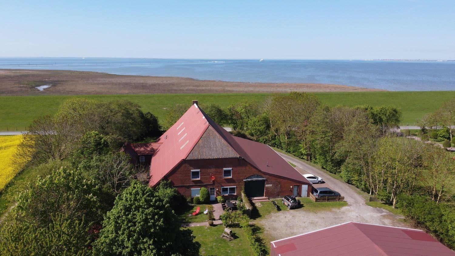 Die ebenerdige und 60 qm grosse Wohnung bietet Platz für bis zu fünf Personen. Sie liegt direkt am Deich; WLAN