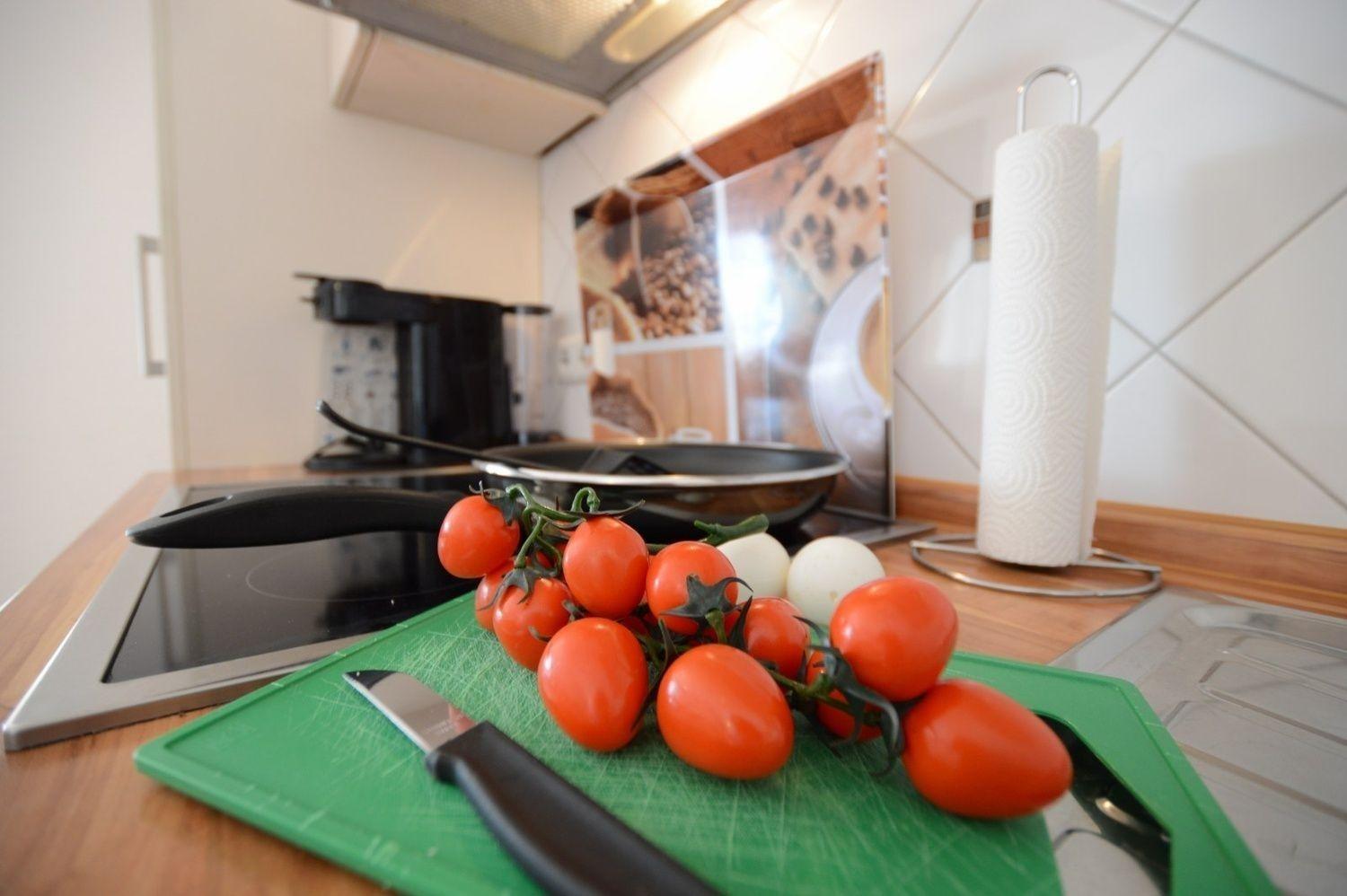 Die neue Einbauküche hat eine angenehme Arbeitshöhe. Durch die komplette Ausstattung mit Kühlschrank/und kleines Gefrierfach, Ceranfeld, Backofen, Geschirrspüler, Kaffeemaschine, Toaster, Wasserkocher, Eierkocher sowie ausreichend Koch- und Essgeschirr bietet sie viel Komfort.