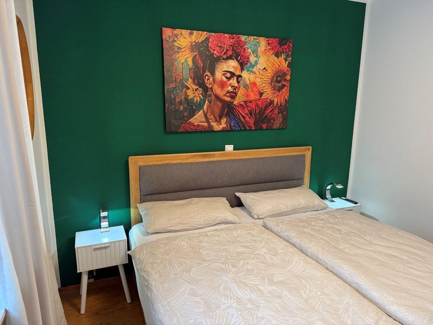 Erholsamer Schlaf im Boxspringbett, zusätzlich Smart-TV im Schlafzimmer. Modernes Bad mit ebenerdiger Dusche und Handtuchwärmer.
