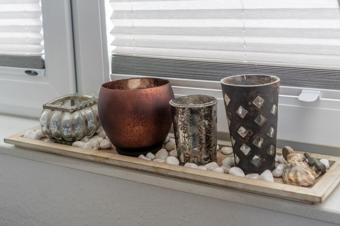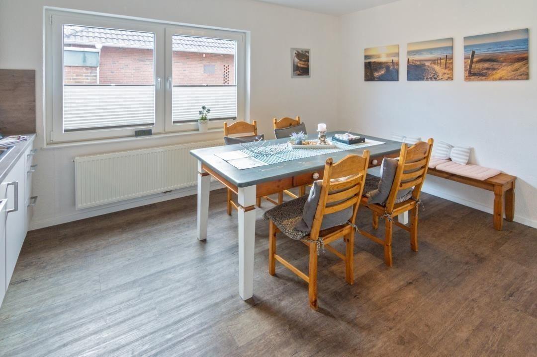 Im Erdgeschoss befindet sich die große Wohnküche, die mit ihrer modernen Ausstattung zum Mittelpunkt des Hauses wird. Die vollständig eingerichtete Küche bietet mit Backofen, Herd, Kaffeemaschine, Mikrowelle, Wasserkocher und reichlich Stauraum alles, was man für die Selbstversorgung im Urlaub benötigt. Der großzügige Esstisch lädt zu gemeinsamen Mahlzeiten ein und bietet die ideale Umgebung für gemütliche Abende. Große Fenster lassen viel Tageslicht in den Raum und unterstreichen die warme, freundliche Atmosphäre des Hauses. Die ausgewählte Dekoration und der maritime Stil schaffen ein Wohlfühlambiente, das Gäste sofort ankommen lässt. So wird das Ferienhaus Westwind schnell zu einem Zuhause auf Zeit.