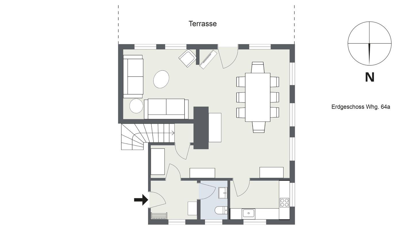 Erdgeschoss: Großes Wohn-/Esszimmer, Küche, Gäste-WC.