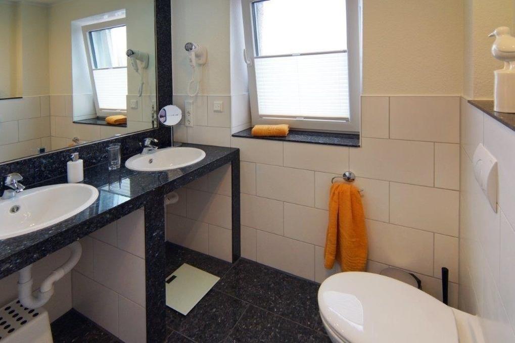 Das komfortable Duschbad ist durch das große Tageslichtfenster hervorragend Belüftet. Der Doppelwaschtisch sorgt für eine angenehme Entzerrung am Morgen und Abend. Hinter den Waschbecken wurde ein großer Spiegel angebracht. Die Dusche lässt sich mit einer Glastür verschließen. Ein Fön liegt bereits für Sie bereit. Besonders in der kalten Jahreszeit wird das Bad durch seine Fußbodenheizung angenehm erwärmt.