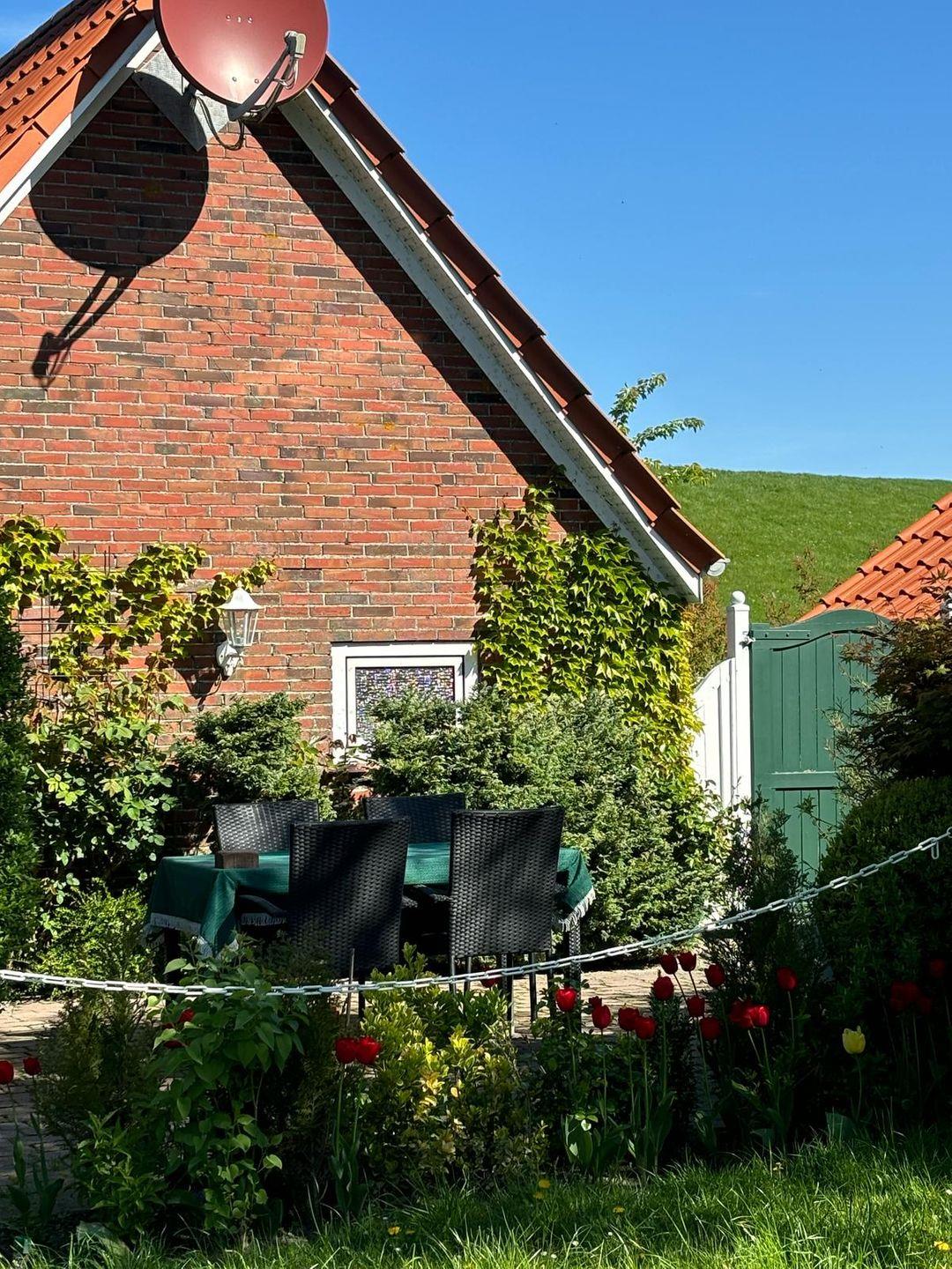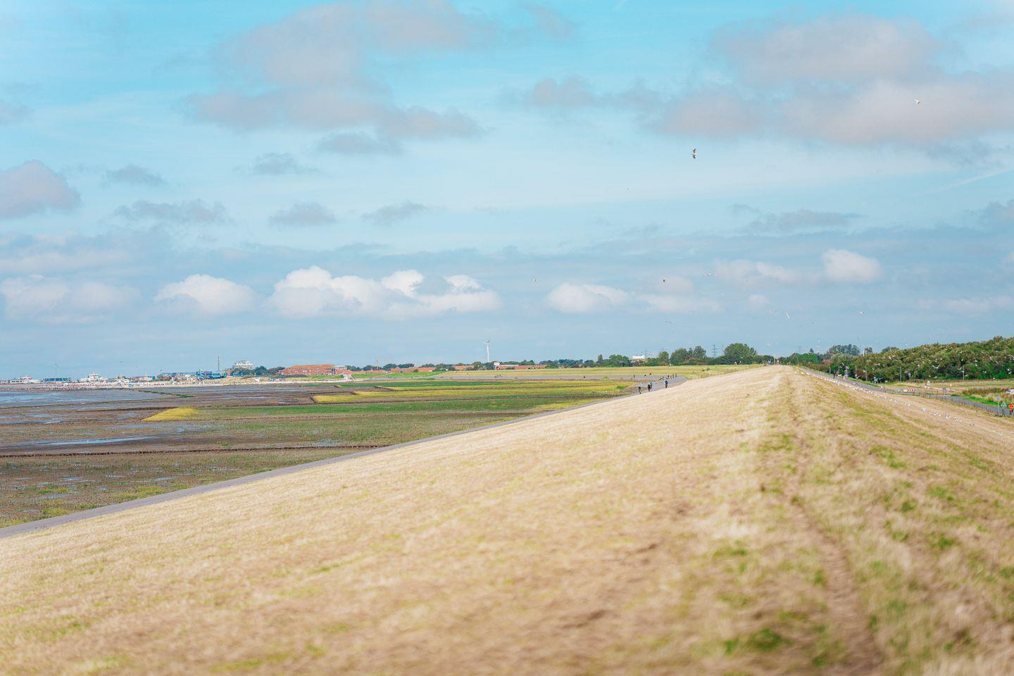 Aus der Haustür raus haben Sie direkt den Blick auf den Deich und dahinter die Nordsee.
