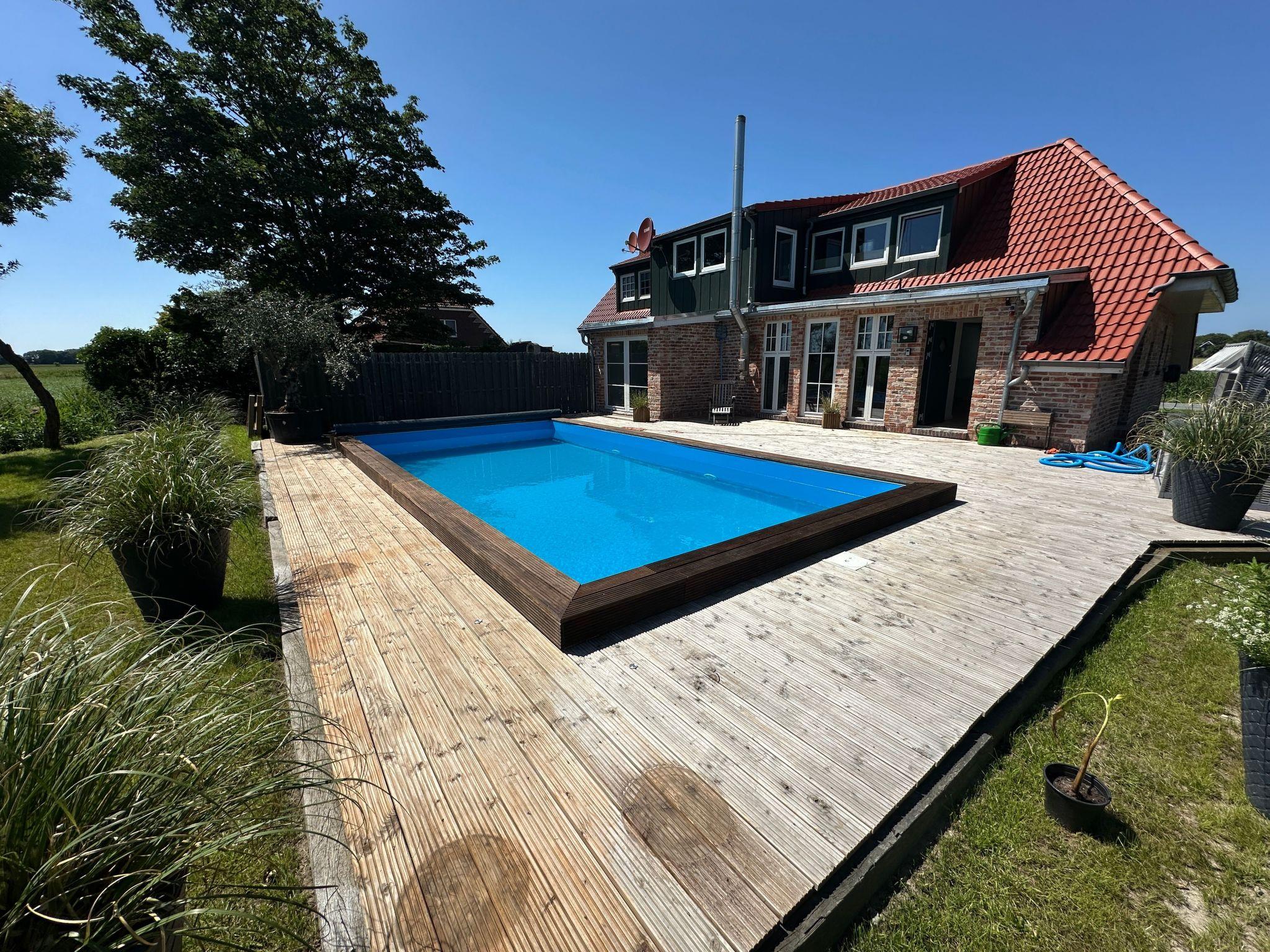 The outdoor area invites you to relax with its spacious wooden terrace, which offers sun all day long. A comfortable lounge set, a wooden table with four chairs, two sun loungers, a beach chair, a hammock and a hanging bench leave nothing to be desired for your relaxation. The highlight is the large, heated pool, which is available from May to October and provides refreshing moments. The approximately 2000 square metre garden also offers a liberating view over fields and meadows, while three free car parking spaces directly at the house offer you the necessary comfort for your mobility.