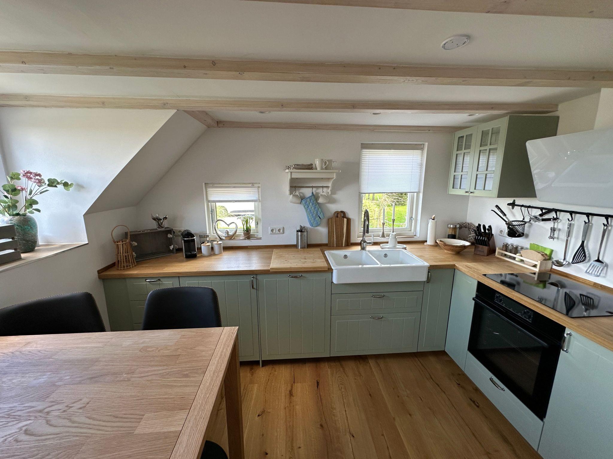 Inside the flat, you will find a bright, modern and high-quality interior that has been completely refurbished over the last two years. Every room has been lovingly designed and fitted with new floors, walls, bathrooms, ceilings, windows, doors, electrics and furniture to provide you with an unrivalled living experience. The kitchen impresses with an induction hob, large side-by-side fridge, dishwasher, oven and washing machine. The beautiful wood-burning stove, which is stocked with a basket of firewood from 01.10. to 30.04. each year, ensures cosy hours, while real wood oak parquet flooring and a smart TV in the living room round off the comfort.