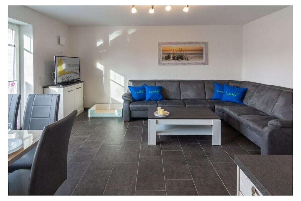 Holiday home Lucky The holiday home (semi-detached house) "Lucky" is located in a traffic-calmed residential area, which is close to the Norden-Norddeich railway line. The house is designed so that four-legged friends can go on holiday with their "masters and mistresses". A combination of living room/kitchen invites you to linger. Here you can cook, eat and make yourself comfortable. There are also dog blankets and baskets. You can reach the terrace via the living room. The 360-degree panoramic view offers a first impression. There are two bedrooms on the ground floor. One of them is equipped with a double bed (180 x 200 cm), which has separate mattresses. The furnishings are complemented by a built-in wardrobe. The second bedroom (right) has a single bed (80 x 200 cm). There are also two further bedrooms on the upper floor. Here too there is a double bed with separate mattresses and a built-in wardrobe. A cot, chest of drawers, bedside tables and alarm clock complete the whole. The second bedroom (left) has the same furnishings (without a cot). There are TVs here. The corner kitchen offers everything you need for a relaxing stay. Modern and functional, it is equipped with an oven, stove, coffee machine and pad machine as well as a refrigerator and microwave. There is also a dishwasher, toaster and the necessary dishes. The dining table, which can accommodate 7 people, is in the living-kitchen area. The bathroom on the ground floor has a shower, toilet, washbasin combination with mirror and hair dryer. There is a washing machine in the storage room. The second bathroom on the upper floor is furnished in the same way, only with a bathtub instead of a shower. Outside, you can make yourself comfortable on the terrace or in the garden (facing west). There is also a seating area waiting for you. The property is fenced in so that small children and dogs can move around freely. There are parking spaces next to the house. In the non-smoking apartment,