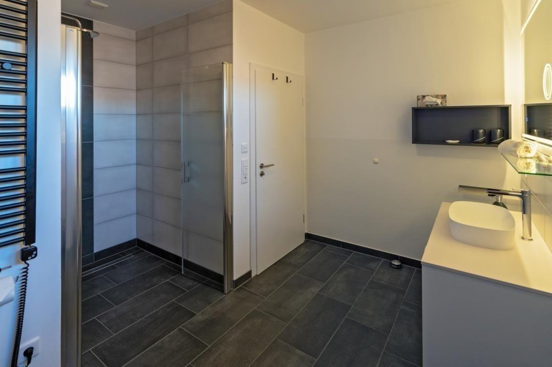 Besonders edel präsentiert sich das Badezimmer. Es verfügt über ein WC, eine Dusche sowie eine moderne Waschkombination mit Spiegel. Auch ein Trockner ist hier vorhanden. Die hochwertigen Fliesen sind in eleganten Anthrazit-Grau-Tönen gehalten. Die große Duschkabine ist ebenerdig begehbar und damit auch barrierefrei zu nutzen. Zusätzlich verfügt Ihre Ferienwohnung über ein separates Gäste-WC.