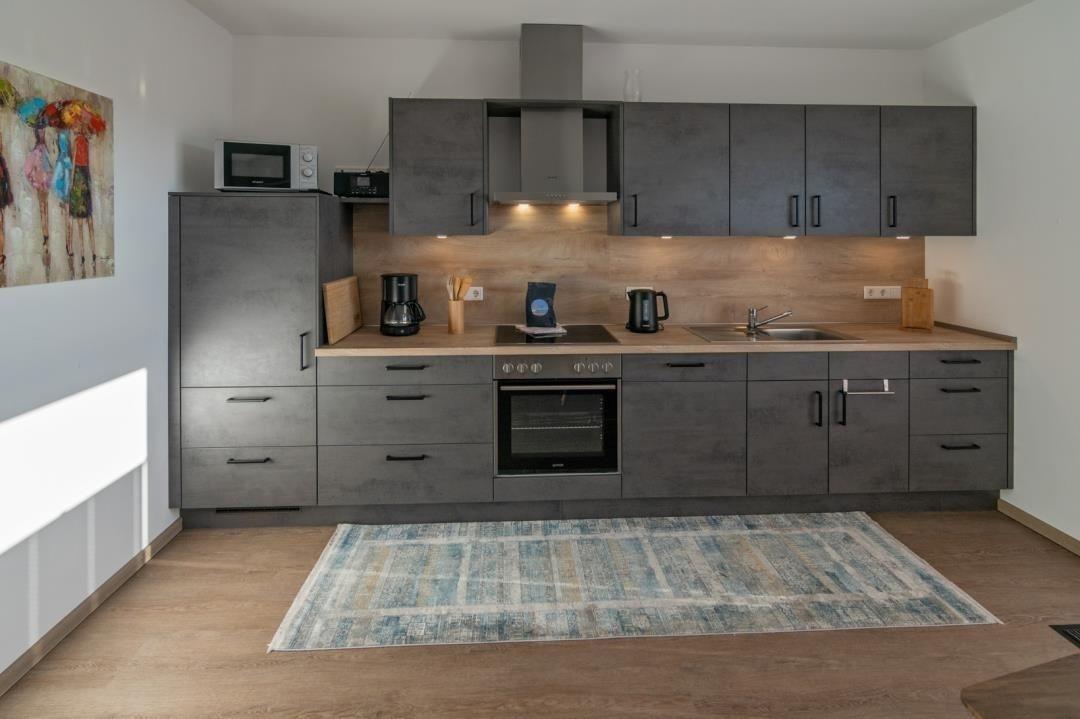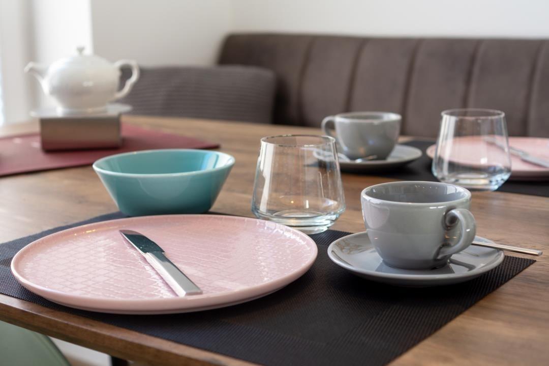 Die moderne Küchenzeile ist funktional mit allem ausgestattet, was Sie benötigen, wenn Sie einmal nicht auswärts essen wollen. Sie verfügt über einen Herd mit vier Kochplatten auf einem Ceranfeld, einen Backofen, einen Kühlschrank, eine Spülmaschine, eine Mikrowelle, eine Kaffeemaschine, einen Toaster, einen Eierkocher sowie ausreichend Geschirr, Gläser und Besteck. Verbringen Sie Ihre Mahlzeiten gemeinsam am einladend gedeckten Esstisch. Auf den modernen und doch bequemen Esszimmerstühlen und der stylischen Sitzbank werden Sie in froher Runde gerne noch das ein oder andere Glas Wein genießen.
