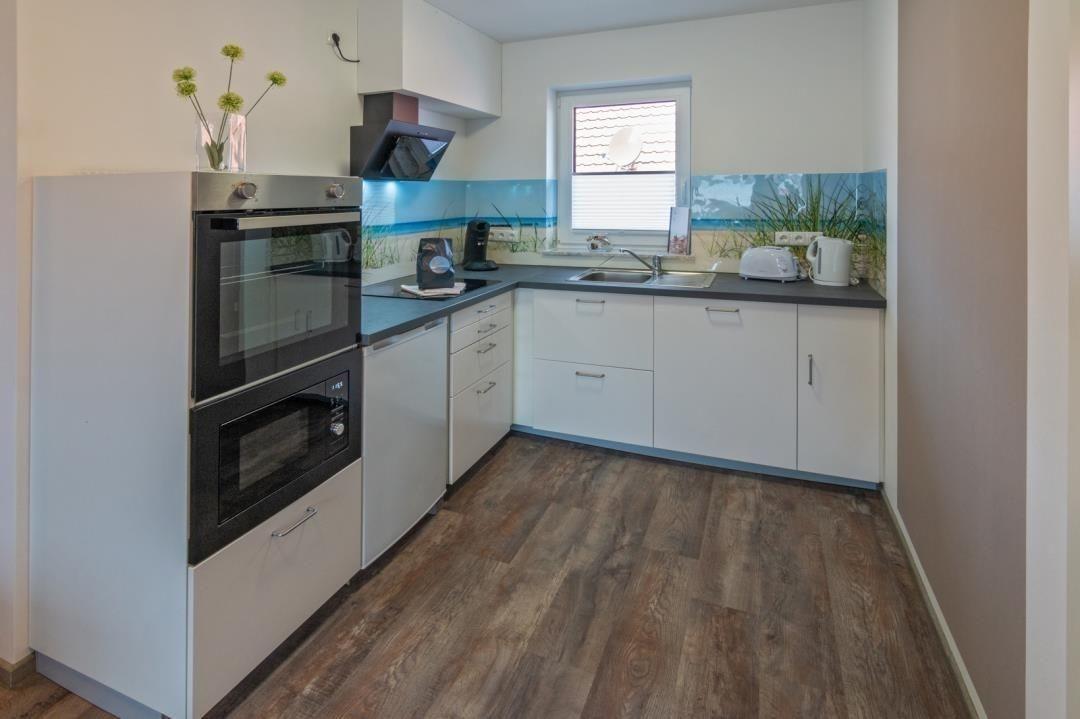 Wohn- und Essbereich mit offener Küche bilden das Zentrum für gemütliches Beisammensein. Wichtig ist, dass die schlichte, helle Küche mit allem ausgestattet wurde, damit Sie auch im Urlaub nach Herzenslust kochen und zusammen speisen können. Spülmaschine, Wasserkocher, Kaffeemaschine und Mikrowelle runden die Kücheneinrichtung ab. Ein Esstisch mit vier Sitzgelegenheiten stehen hier ebenfalls zur Verfügung.