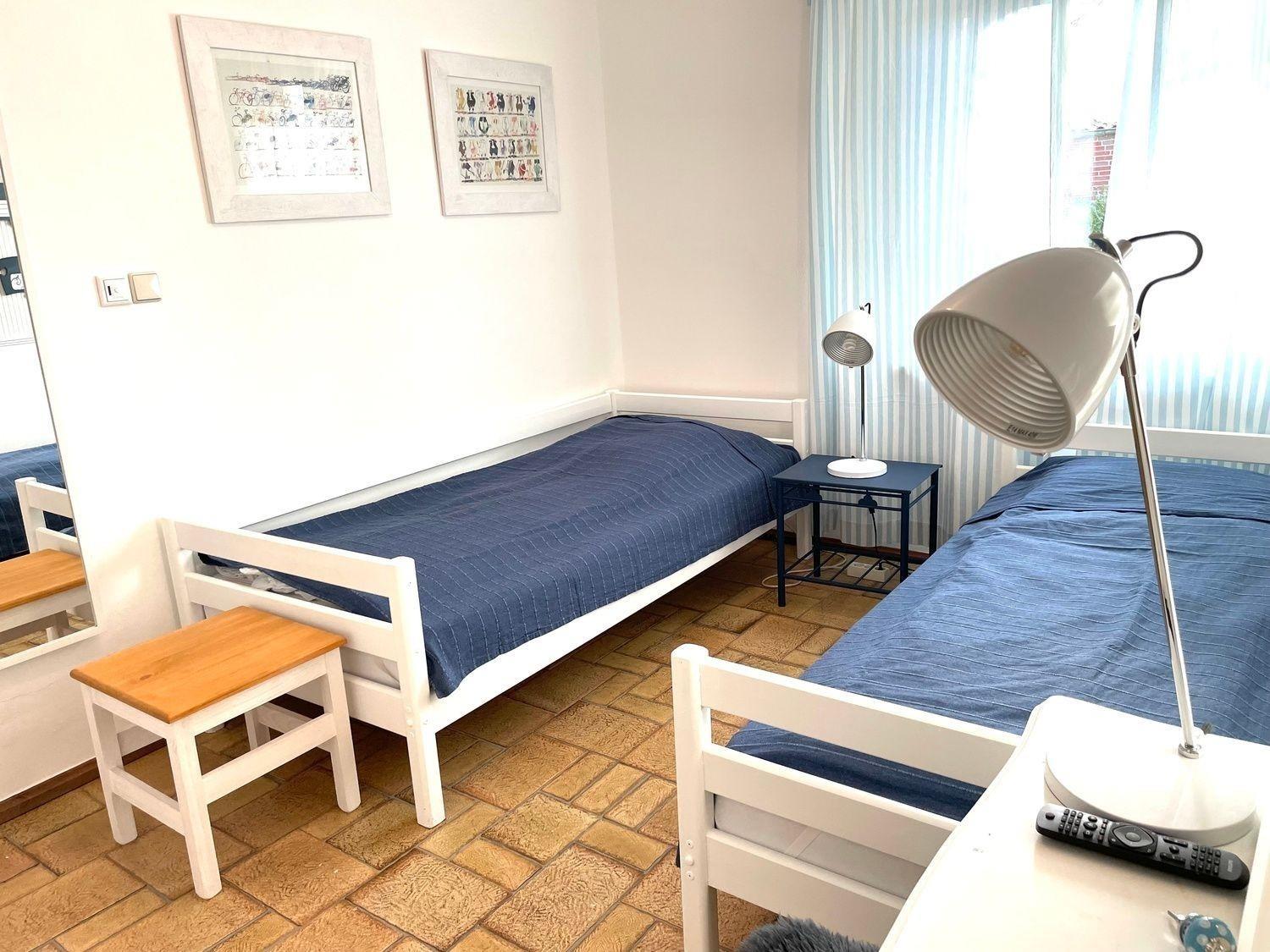 Im zweiten Schlafzimmer stehen 2 massive Einzelbetten.