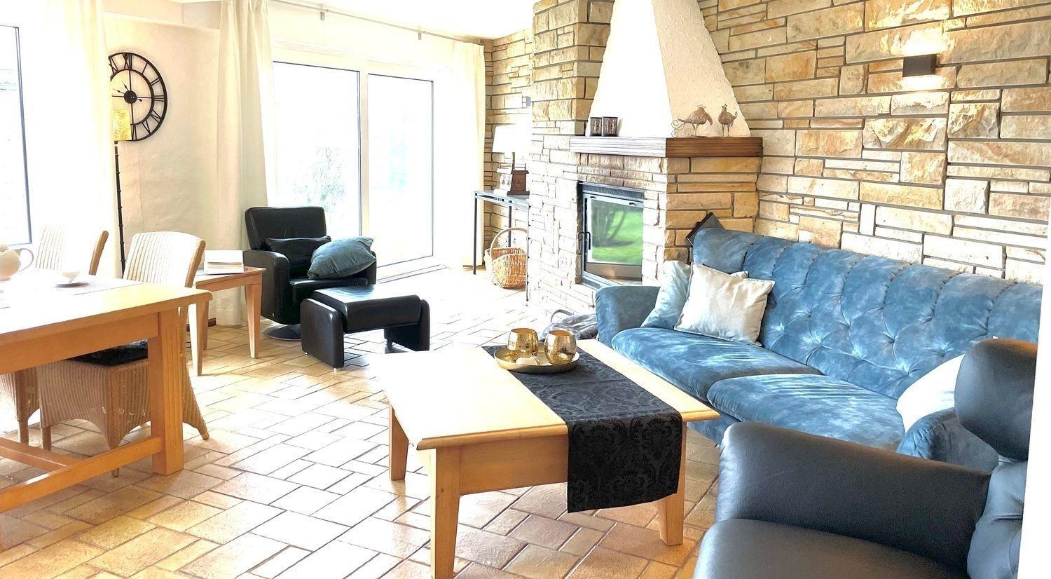 In der Wand aus Naturstein befindet sich der Kamin, der zu gemütlichen Abenden am knisternden Feuer einlädt.