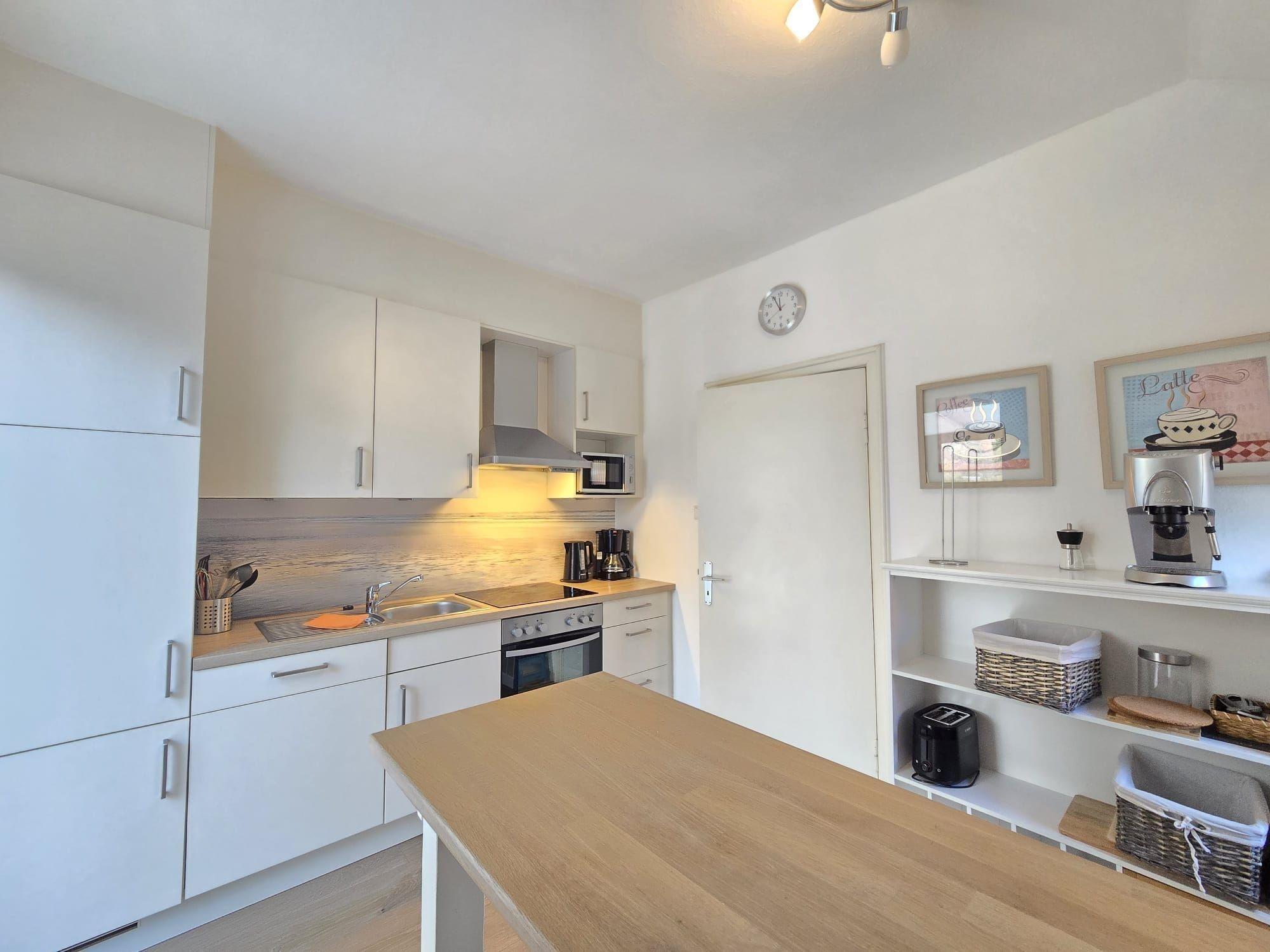 Die Ferienwohnung bietet eine komfortable und allergikergeeignete Unterkunft mit insgesamt drei Schlafzimmern, ausgestattet mit zwei Doppelbetten und zwei Einzelbetten. Die separate Küche verfügt über moderne Annehmlichkeiten wie Geschirrspüler, Elektro- und Gasherd, Backofen, Mikrowelle und Kühlschrank, perfekt für die Zubereitung von Mahlzeiten. Ein gemütlicher Esstisch und eine Kaffeemaschine runden den Kochbereich ab. Die beiden Badezimmer, eines mit bodengleicher Dusche und Fenster, bieten zusätzliche Annehmlichkeiten wie Haartrockner und ein Starterset für die persönliche Hygiene. Für Unterhaltung sorgen ein TV und eine HiFi-Anlage. Ein Parkplatz ist vorhanden. Zudem stehen ein Kinderhochstuhl, Kindersicherungen für Steckdosen und ein Treppenschutz zur Verfügung, was die Wohnung ideal für Familien macht. Internet mit WLAN und komfortable Möbel sorgen für einen entspannten Aufenthalt.