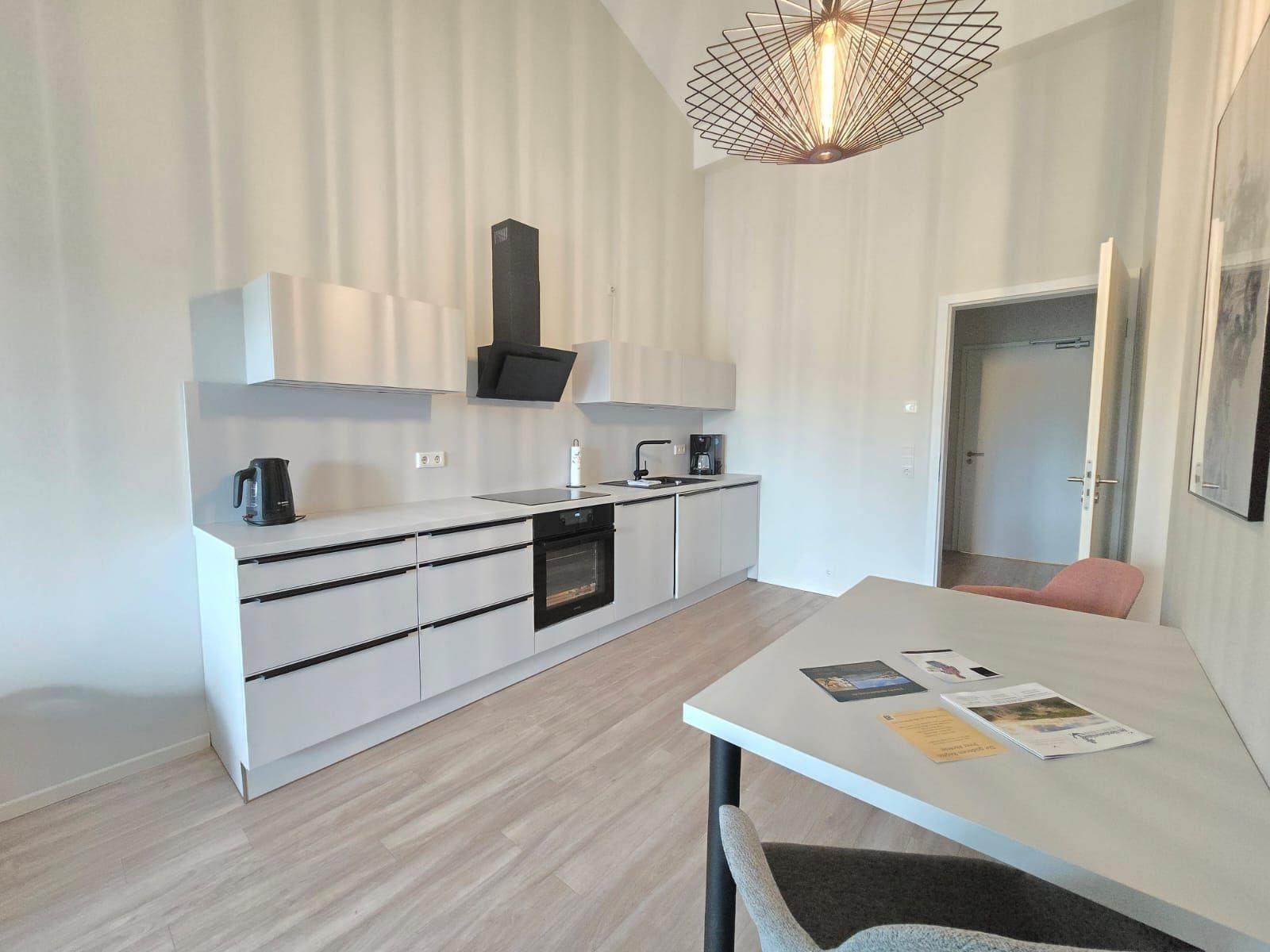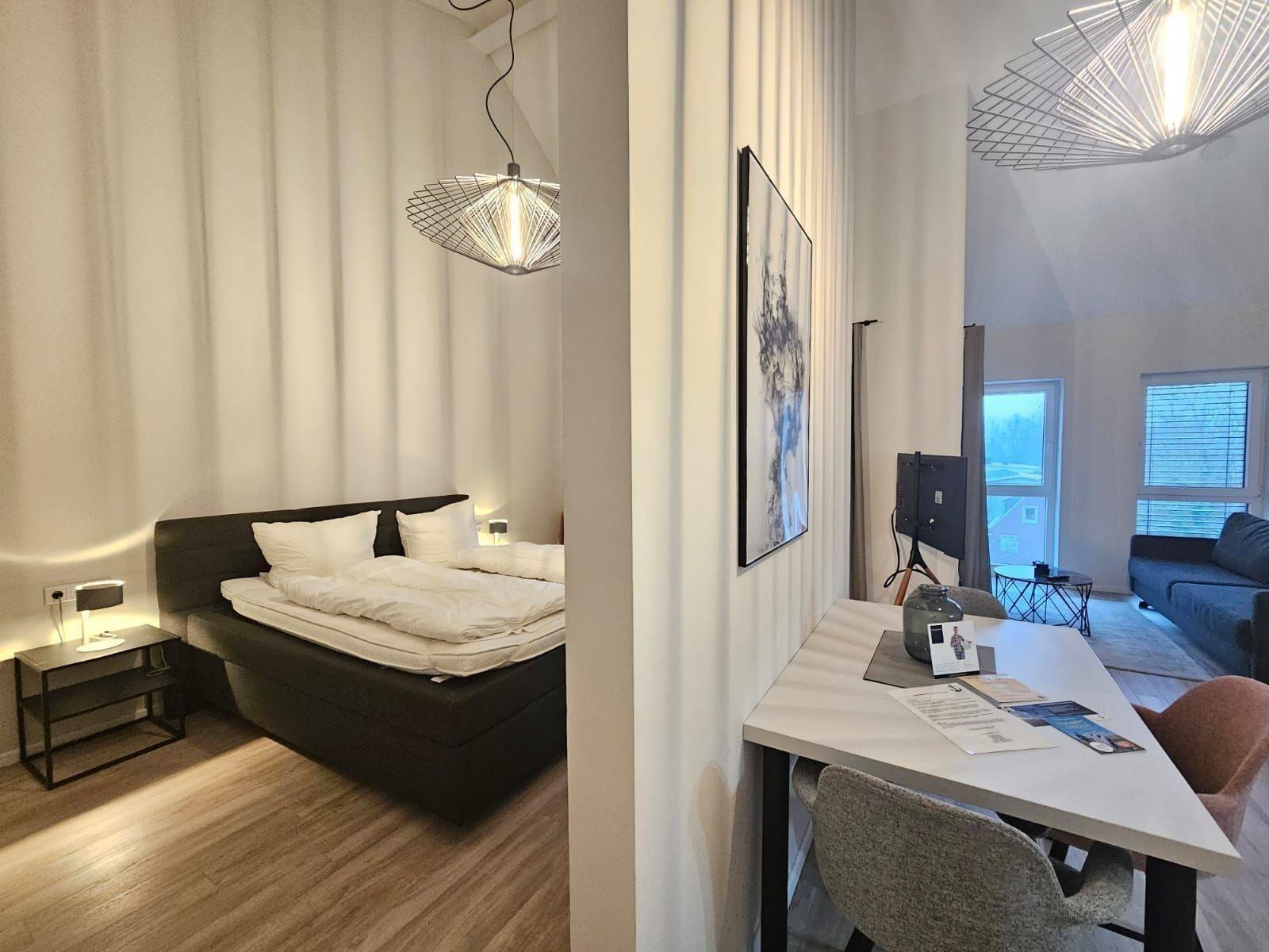 Die Ferienwohnung bietet ein modernes und komfortables Ambiente für einen entspannenden Aufenthalt. Sie verfügt über ein geräumiges Schlafzimmer mit einem Doppelbett und ein einladendes Wohnschlafzimmer, in dem eine Schlafcouch für zusätzliche Schlafmöglichkeiten sorgt. Die offene Küche ist perfekt ausgestattet mit einem Elektro-/Gasherd, Geschirrspüler, Backofen und Kühlschrank, ideal für die Zubereitung von Mahlzeiten. Für Familien steht ein Kinderhochstuhl bereit. Das Duschbad bietet eine bodengleiche Dusche, Haartrockner und praktische Startersets. Die Wohnung ist allergikergeeignet und mit Fußbodenheizung sowie einer HiFi-Anlage für angenehme Akustik ausgestattet. WLAN ist kostenlos verfügbar. Ein Parkplatz am Haus sowie ein Fahrstuhl sind vorhanden. Die gemütliche Einrichtung mit Sofa, Esstisch, und Spieleauswahl sorgt für ein komfortables Wohngefühl. Reinigungsmittel und Geschirr stehen ebenfalls bereit, um den Aufenthalt so angenehm wie möglich zu gestalten.