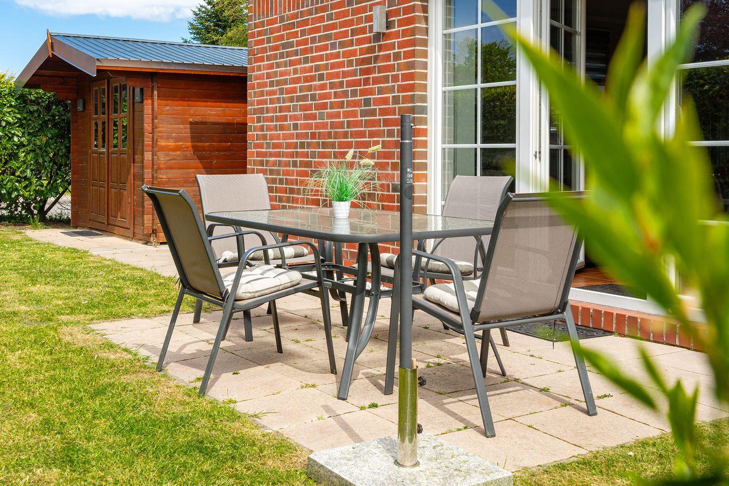 Zum Haus gehört eine möblierte Terrasse, ein Grill und ein großes Gartenhaus für evtl. mitgebrachte Fahrräder.