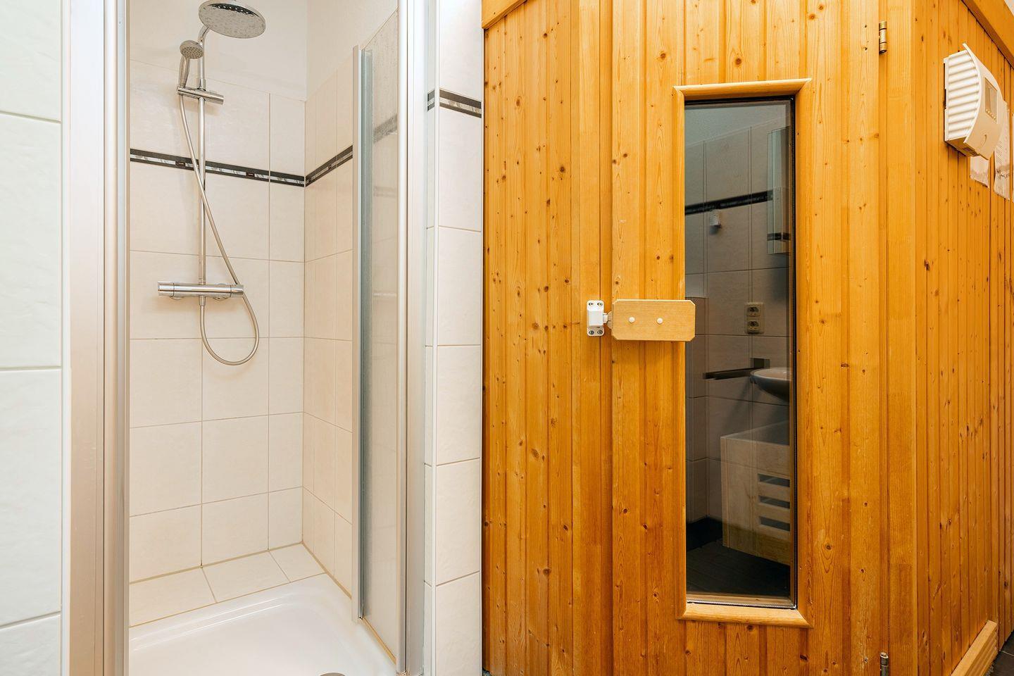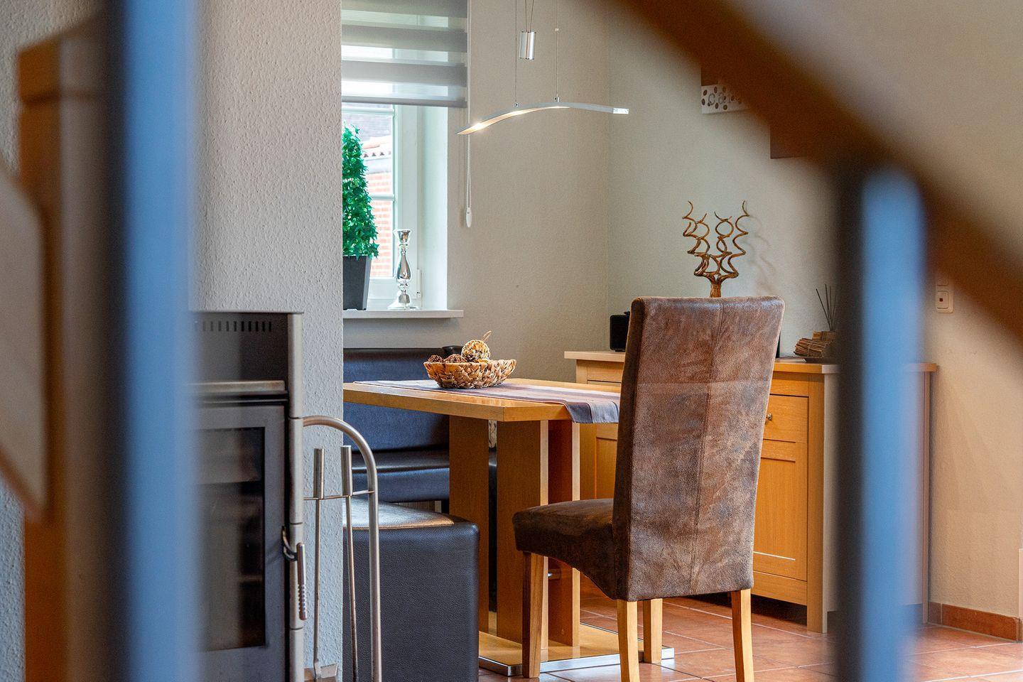 Im Erdgeschoss befindet sich der große komplett geflieste Wohn-/Essbereich mit angenehmer Fußbodenerwämung und offener, komplett ausgestatteter Einbauküche (Mikrowelle, Backofen, Ceranfeld, Geschirrspülmaschine, Kaffeemaschine, Toaster u.v.m). Desweiteren befinden sich ein Schlafraum mit einem Doppelbett und ein Duschbad mit Münzsauna (90 min. kosten 6 Euro für min. 3 Personen) im Erdgeschoss. Der Wohnbereich verfügt über eine gemütliche Ledergarnitur in der man es sich vor dem großen Flachbild-Fernseher oder dem Kaminofen gut gehen lassen kann. Eine Musikanlage gehört auch zum Inventar.