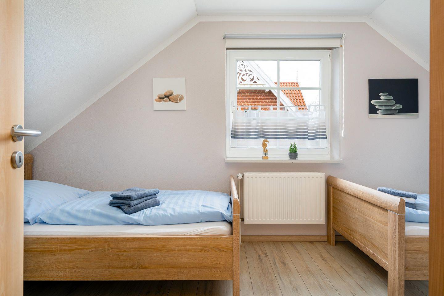 Im Obergeschoss befinden sich 2 weitere Schlafräume (1*1 Doppelbett und 1*2 Einzelbetten) und ein weiteres Duschbad. Die Schlafräume sind mit Laminat ausgelegt.