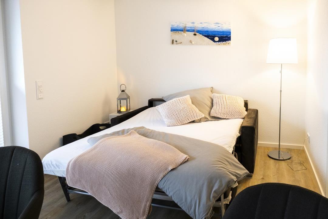 Die in 2020 fertiggestellte 55 qm große Erdgeschoss Wohnung ist geeignet für bis zu 3 Personen mit Kleinkind. Zu der hellen 2-Raum Wohnung gehört eine große, geschützte Terrasse in Südlage und eine Rasenfläche als Liegewiese. Die Wohnung ist eine Nichtraucherwohnung und allergikerfreundlich eingerichtet (z.B. Centa-Star Bettwaren, keine Gardinen, keine Teppiche). Haustiere sind nicht gestattet.