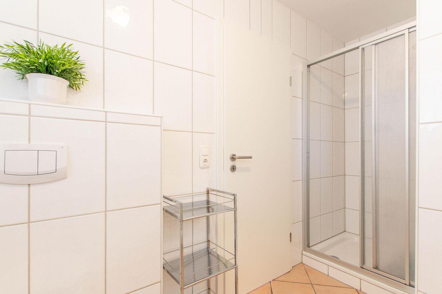 Im Badezimmer ist eine Dusche mit flachem Einstieg. Das große Wohnzimmer hat ein offenes Wohnraumkonzept mit Essbereich und Küche. Die Küche ist gut ausgestattet.