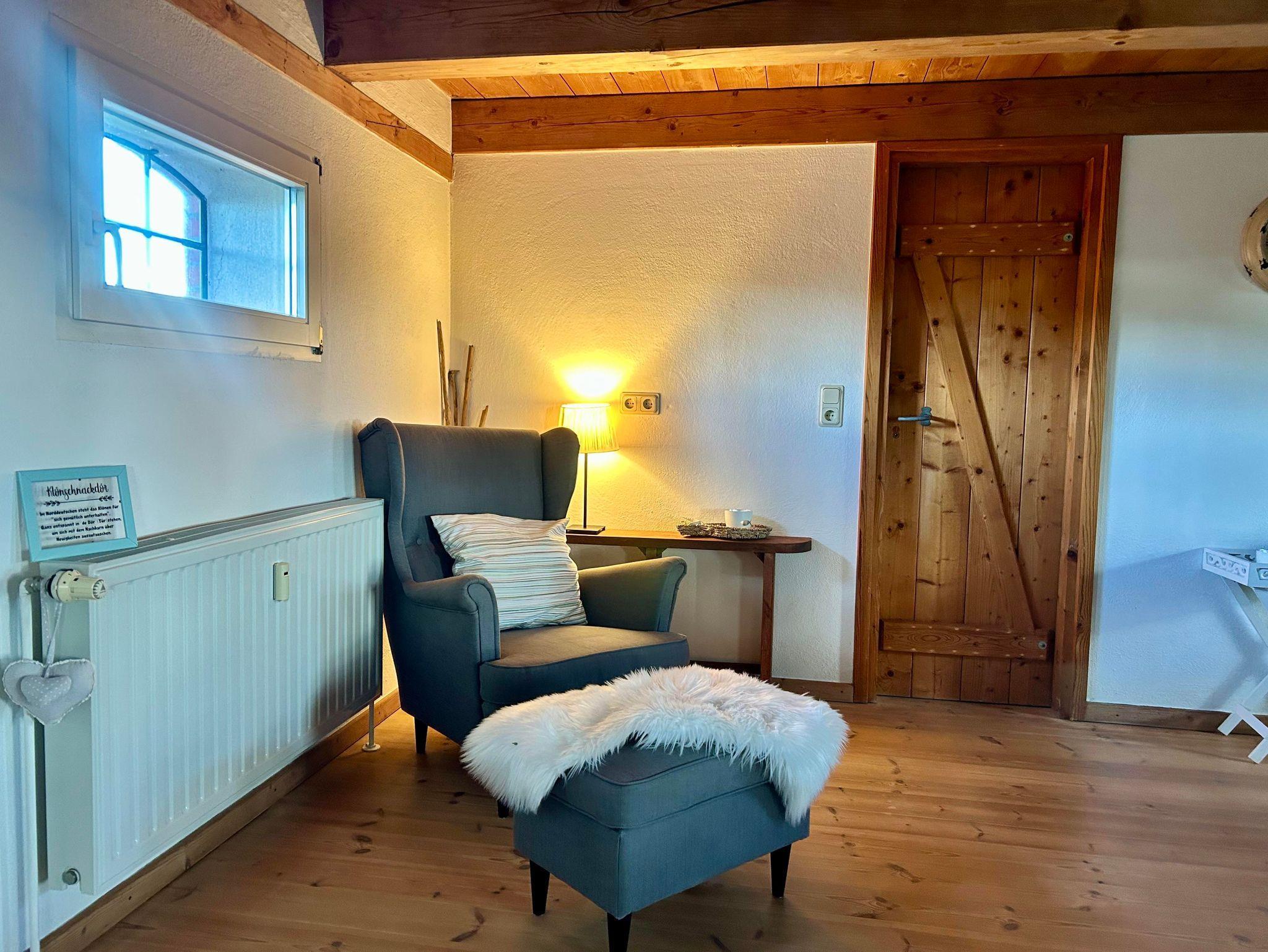 Unsere Reetdachkate bietet Platz für 4 Erwachsene, 1 Kind (Kinderbett) und 1 Kleinkind (Babybett + Hochstuhl).