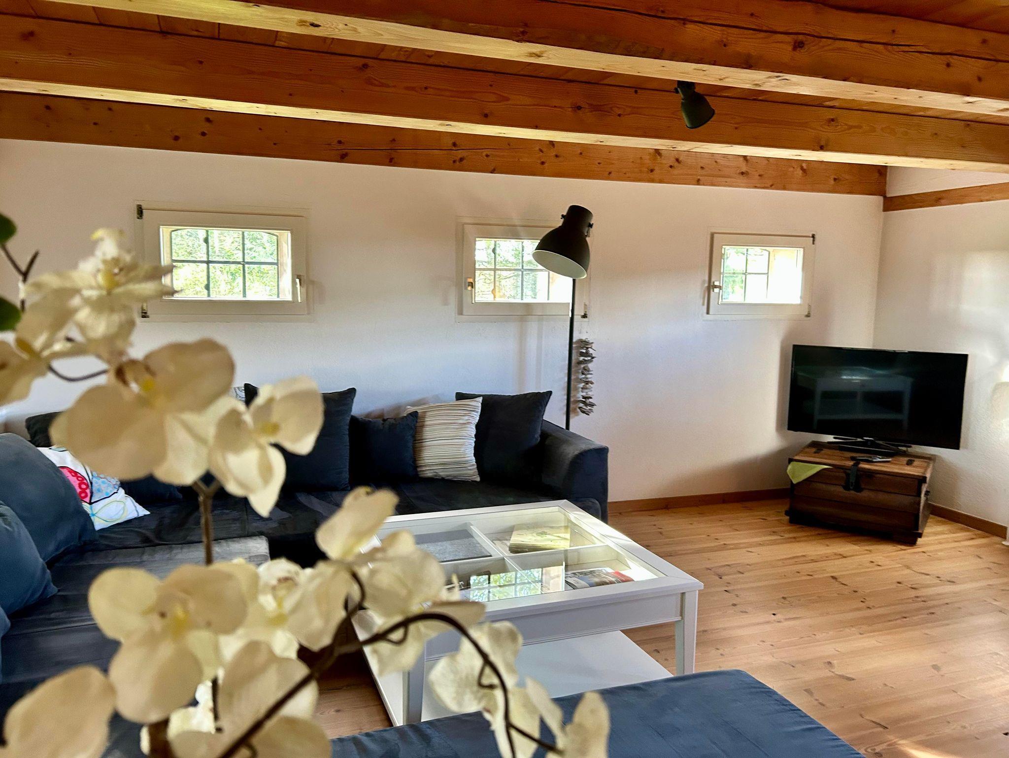 Alle Räume sind hell und lichtdurchflutet mit Holzböden (außer Bäder und Küche), Holzdecken und sichtbarem Ständerwerk.