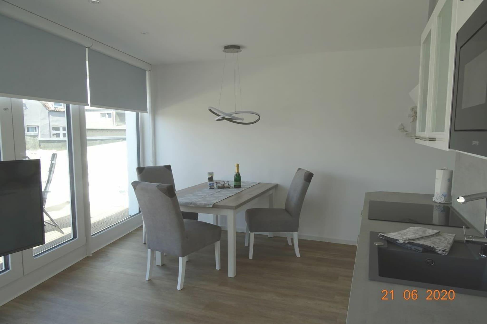 I 4. etasje: (entré, Kjøkken(TV, spisebord, radio, vannkoker, brødrister, komfyr, kaffetrakter, stekovn, grill, mikrobølgeovn, oppvaskmaskin, kjøleskap, dusj, Parasoll, Inkl. håndklær), Stue/soverom(1 persons sovesofa, TV), soveværelse(dobbeltseng, TV, radio), bad(dusj, Inkl. håndklær)) balkon, terrasse, hagemøbler